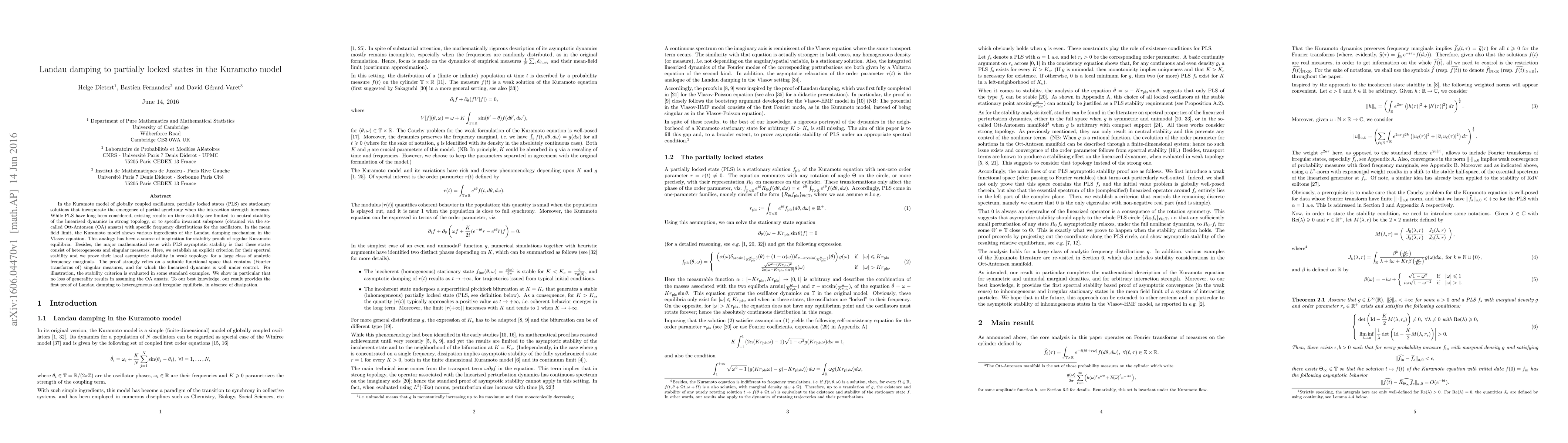 In the Kuramoto model of globally coupled oscillators, partially locked states (PLS) are stationary solutions that incorporate the emergence of partial synchrony when the interaction strength increases. While PLS have long been considered, existing results on their stability are limited to neutral stability of the linearized dynamics in strong topology, or to specific invariant subspaces (obtained via the so-called Ott-Antonsen (OA) ansatz) with specific frequency distributions for the oscillators. In the mean field limit, the Kuramoto model shows various ingredients of the Landau damping mechanism in the Vlasov equation. This analogy has been a source of inspiration for stability proofs of regular Kuramoto equilibria. Besides, the major mathematical issue with PLS asymptotic stability is that these states consist of heterogeneous and singular measures. Here, we establish an explicit criterion for their spectral stability and we prove their local asymptotic stability in weak topology, for a large class of analytic frequency marginals. The proof strongly relies on a suitable functional space that contains (Fourier transforms of) singular measures, and for which the linearized dynamics is well under control. For illustration, the stability criterion is evaluated in some standard examples. We show in particular that no loss of generality results in assuming the OA ansatz. To our best knowledge, our result provides the first proof of Landau damping to heterogeneous and irregular equilibria, in absence of dissipation.