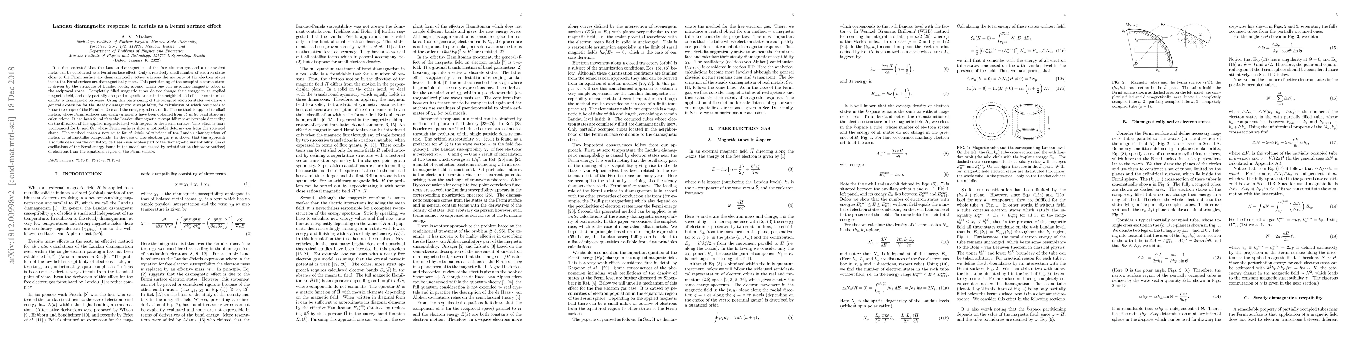 This paper demonstrates that Landau diamagnetism in metals is primarily a Fermi surface effect, with only electron states near the Fermi surface being diamagnetically active. The method provides a general expression for diamagnetic susceptibility, revealing anisotropy in alkali metals, especially in Li and Cs, due to their deformed Fermi surfaces.