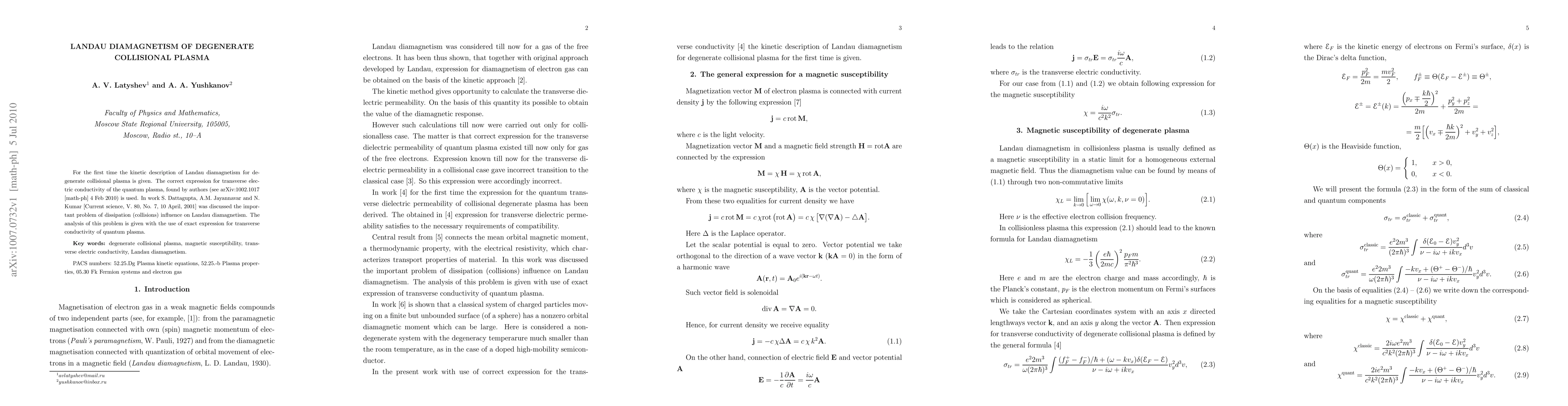 This paper presents the first kinetic description of Landau diamagnetism in a degenerate collisional plasma, utilizing an exact expression for the plasma's transverse electric conductivity. It analyzes the influence of dissipation (collisions) on Landau diamagnetism, building on prior work by S. Dattagupta, A.M. Jayannavar, and N. Kumar.