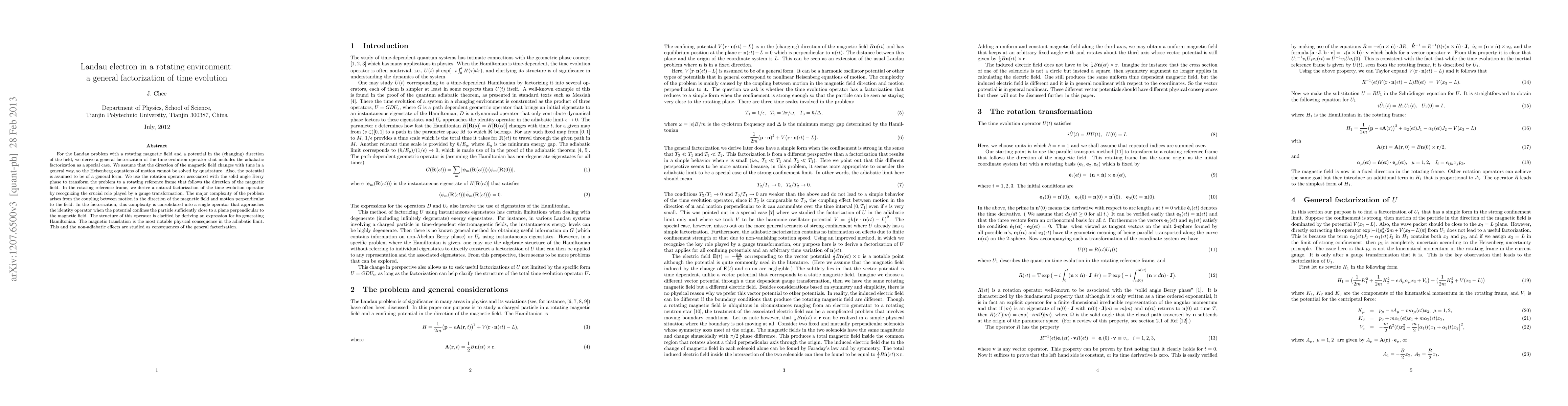For the Landau problem with a rotating magnetic field and a potential in the (changing) direction of the field, we derive a general factorization of the time evolution operator that includes the adiabatic factorization as a special case. We assume that the direction of the magnetic field changes with time in a general way, so the Heisenberg equations of motion cannot be solved by quadrature. Also, the potential is assumed to be of a general form. We use the rotation operator associated with the solid angle Berry phase to transform the problem to a rotating reference frame that follows the direction of the magnetic field. In the rotating reference frame, we derive a natural factorization of the time evolution operator by recognizing the crucial role played by a gauge transformation. The major complexity of the problem arises from the coupling between motion in the direction of the magnetic field and motion perpendicular to the field. In the factorization, this complexity is consolidated into a single operator that approaches the identity operator when the potential confines the particle sufficiently close to a plane perpendicular to the magnetic field. The structure of this operator is clarified by deriving an expression for its generating Hamiltonian. The magnetic translation is the most notable physical consequence in the adiabatic limit. This and the non-adiabatic effects are studied as consequences of the general factorization.