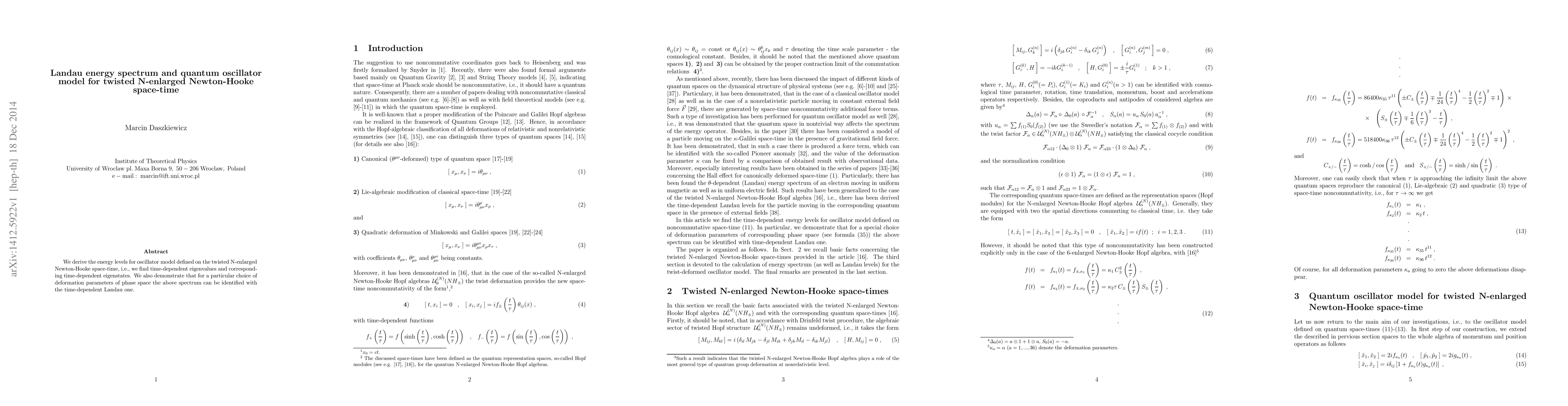 This paper derives the energy levels for an oscillator model on twisted N-enlarged Newton-Hooke space-time, revealing time-dependent eigenvalues and eigenstates. It also shows that under specific deformation parameters, the derived spectrum matches the time-dependent Landau energy spectrum.