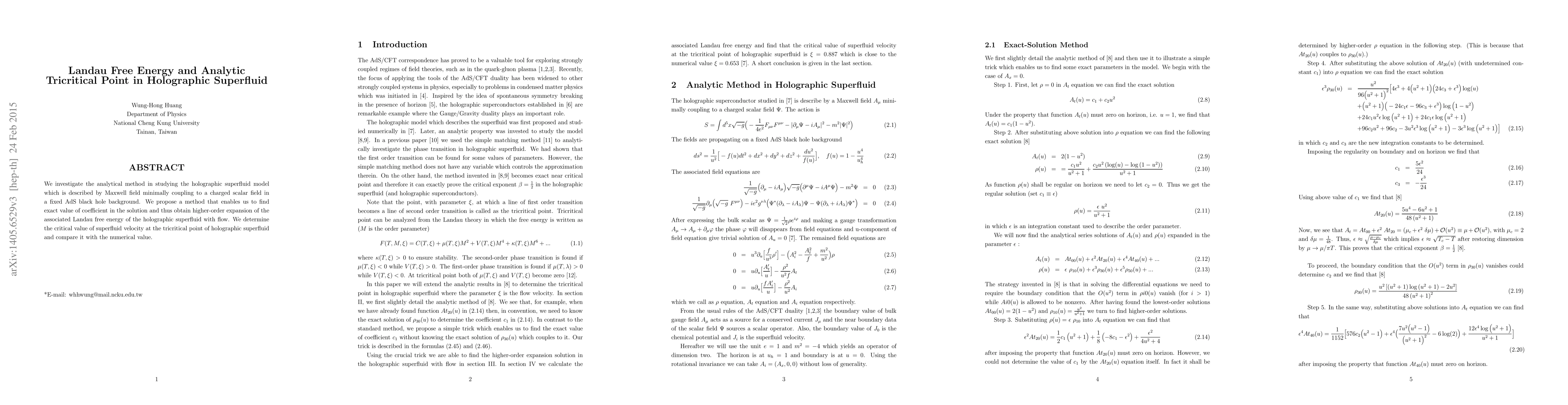 This paper proposes an analytical method to determine the exact coefficient in the holographic superfluid model, leading to a higher-order expansion of the Landau free energy. It identifies the critical value of superfluid velocity at the tricritical point and compares it with numerical results.
