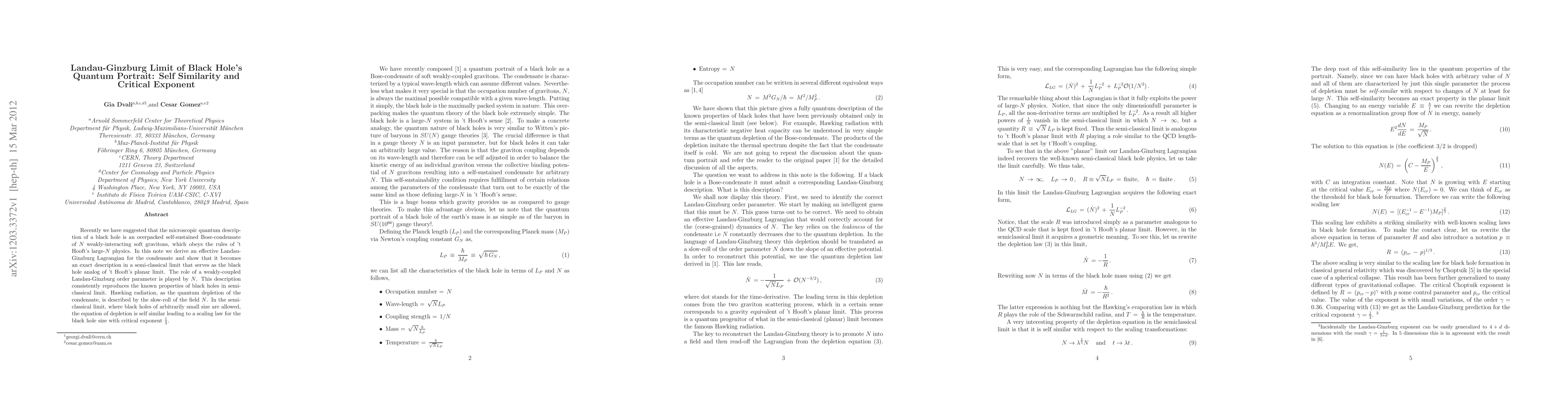 Recently we have suggested that the microscopic quantum description of a black hole is an overpacked self-sustained Bose-condensate of N weakly-interacting soft gravitons, which obeys the rules of 't Hooft's large-N physics. In this note we derive an effective Landau-Ginzburg Lagrangian for the condensate and show that it becomes an exact description in a semi-classical limit that serves as the black hole analog of 't Hooft's planar limit. The role of a weakly-coupled Landau-Ginzburg order parameter is played by N. This description consistently reproduces the known properties of black holes in semi-classical limit. Hawking radiation, as the quantum depletion of the condensate, is described by the slow-roll of the field N. In the semiclassical limit, where black holes of arbitrarily small size are allowed, the equation of depletion is self similar leading to a scaling law for the black hole size with critical exponent 1/3.