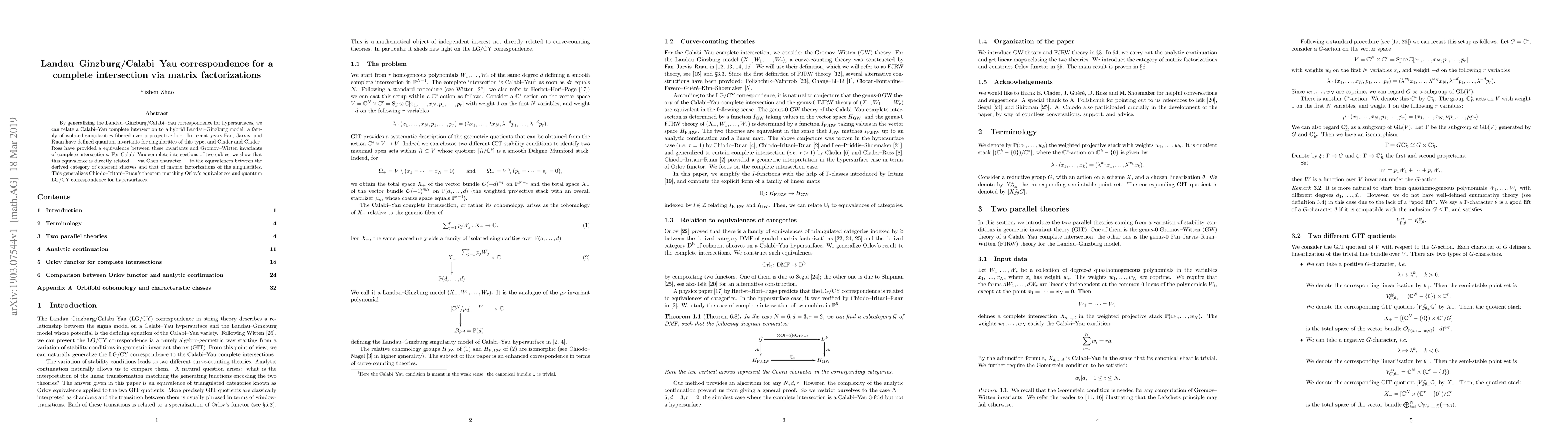 This paper extends the Landau-Ginzburg/Calabi-Yau correspondence to Calabi-Yau complete intersections via matrix factorizations, showing an equivalence between quantum invariants of hybrid Landau-Ginzburg models and Gromov-Witten invariants of complete intersections, which relates to derived category equivalences.