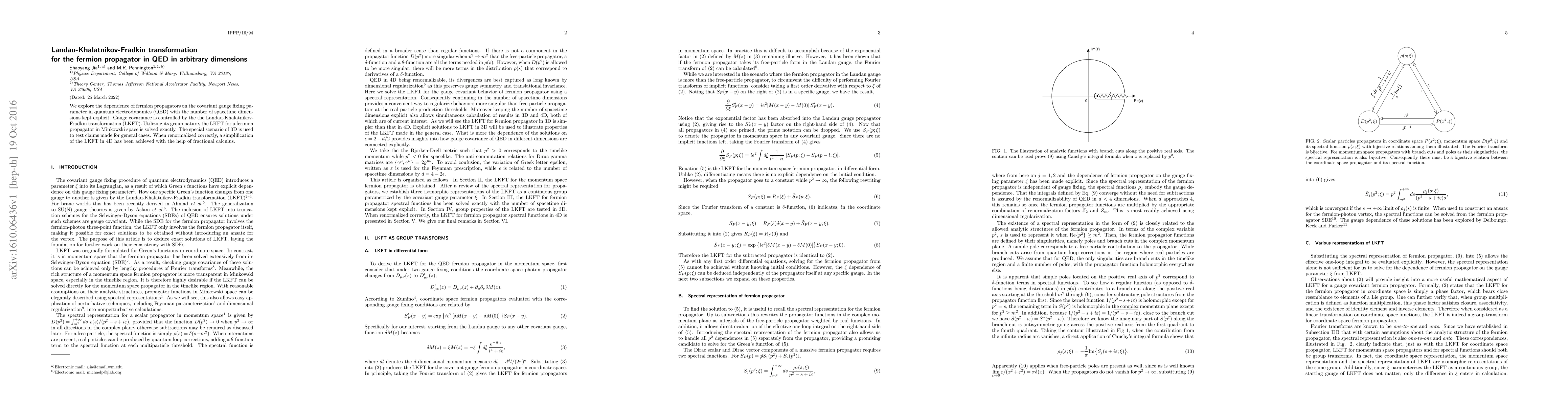 This paper investigates the effect of gauge fixing on fermion propagators in QED across various dimensions, applying the Landau-Khalatnikov-Fradkin transformation. It demonstrates exact solutions for fermion propagators using the LKFT's group nature, particularly simplifying the case in 4D with fractional calculus.