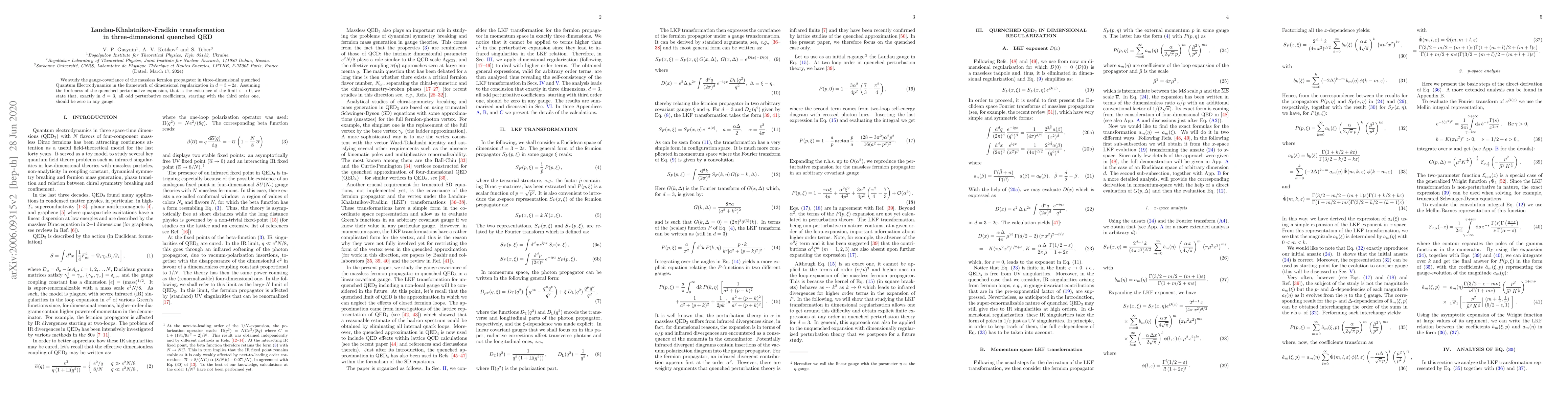 This paper investigates the gauge-covariance of the massless fermion propagator in three-dimensional quenched Quantum Electrodynamics using dimensional regularization. It concludes that, in three dimensions, all odd perturbative coefficients vanish in any gauge, assuming the finiteness of the quenched perturbative expansion.