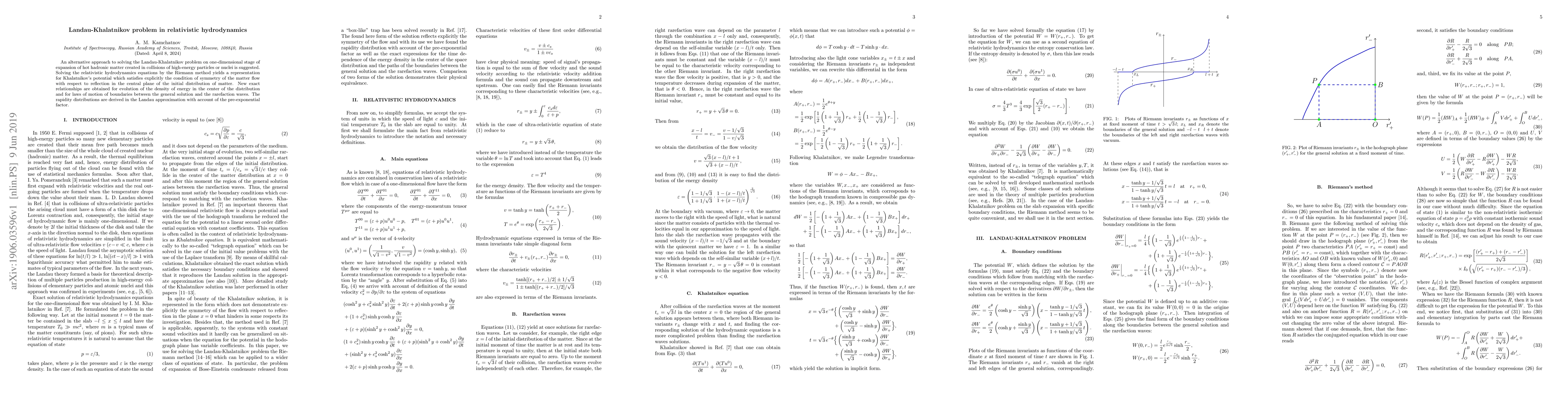 An alternative approach to solving the Landau-Khalatnikov problem on one-dimensional stage of expansion of hot hadronic matter created in collisions of high-energy particles or nuclei is suggested. Solving the relativistic hydrodynamics equations by the Riemann method yields a representation for Khalatnikov's potential which satisfies explicitly the condition of symmetry of the matter flow with respect to reflection in the central plane of the initial distribution of matter. New exact relationships are obtained for evolution of the density of energy in the center of the distribution and for laws of motion of boundaries between the general solution and the rarefaction waves. The rapidity distributions are derived in the Landau approximation with account of the pre-exponential factor.