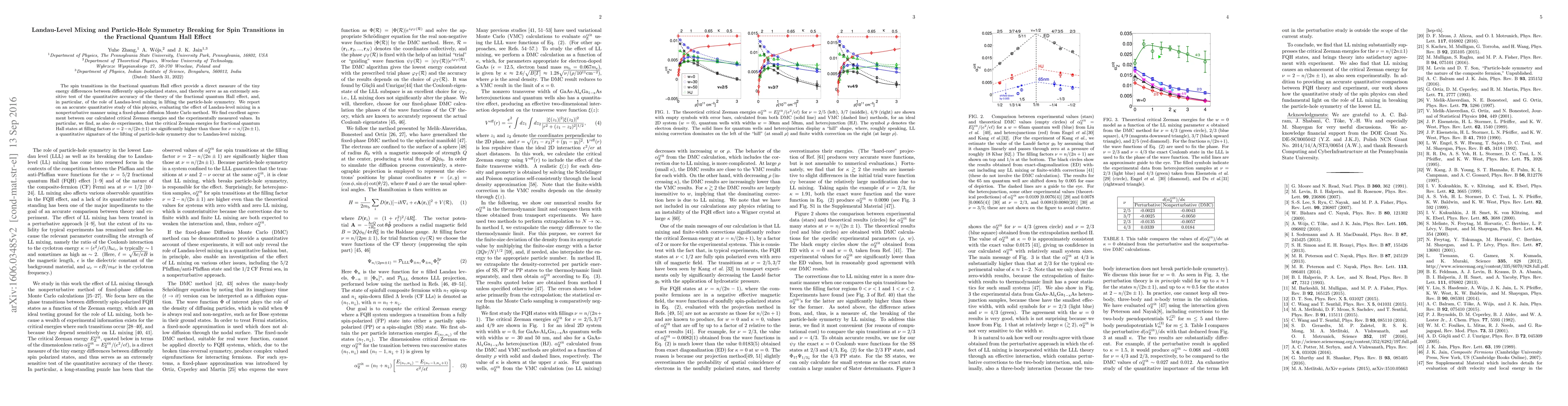 This study investigates spin transitions in the fractional quantum Hall effect, focusing on the role of Landau-level mixing in breaking particle-hole symmetry. Using a fixed-phase diffusion Monte Carlo method, it finds strong agreement between calculated critical Zeeman energies and experimental measurements, confirming the lifting of particle-hole symmetry.