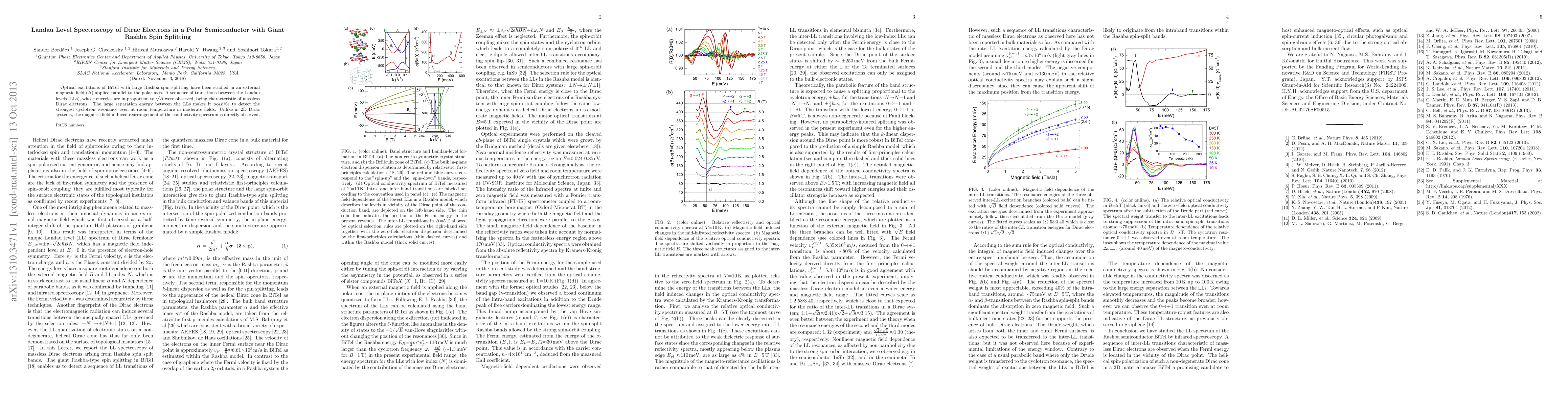 Optical excitations of BiTeI with large Rashba spin splitting have been studied in an external magnetic field ($B$) applied parallel to the polar axis. A sequence of transitions between the Landau levels (LLs), whose energies are in proportion to $\sqrt{B}$ were observed, being characteristic of massless Dirac electrons. The large separation energy between the LLs makes it possible to detect the strongest cyclotron resonance even at room temperature in moderate fields. Unlike in 2D Dirac systems, the magnetic field induced rearrangement of the conductivity spectrum is directly observed.