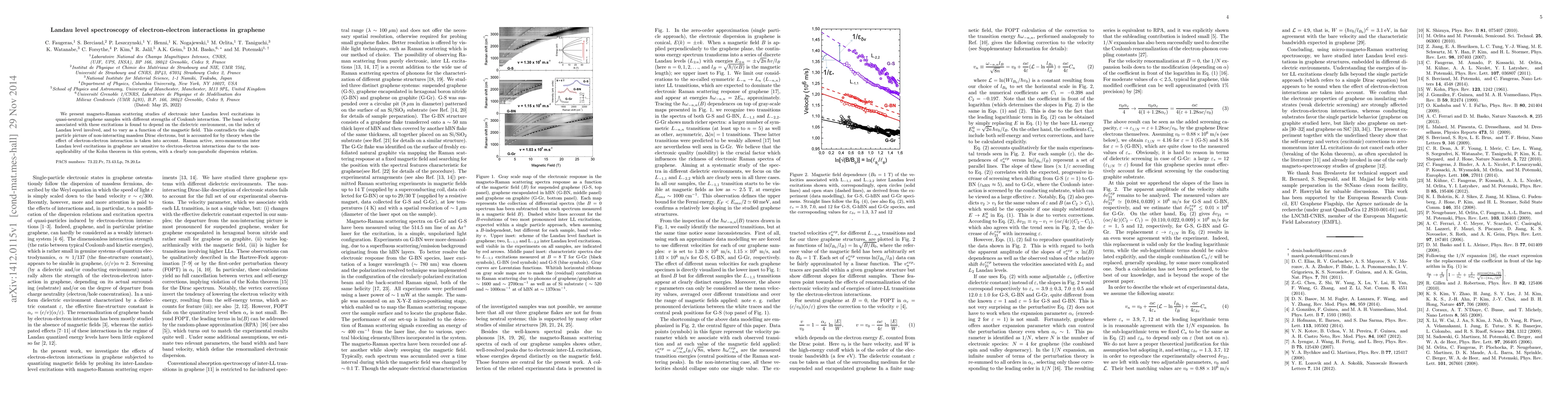 This study uses magneto-Raman spectroscopy to investigate electron-electron interactions in graphene, revealing that band velocity for Landau level excitations varies with dielectric environment, magnetic field, and Landau level index, contradicting the single-particle model and highlighting the importance of electron-electron interactions. The findings show non-parabolic dispersion relations due to the non-applicability of the Kohn theorem in graphene.