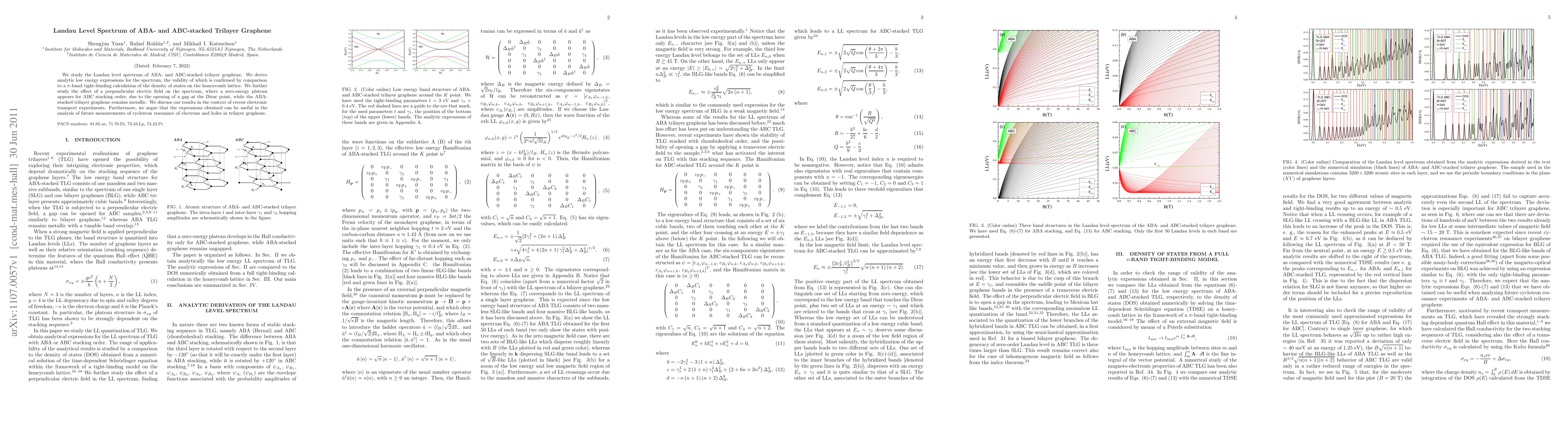 This study derives analytic expressions for the Landau level spectrum in ABA- and ABC-stacked trilayer graphene, validated by π-band tight-binding calculations. A zero-energy plateau is observed in ABC stacking under an electric field due to a gap opening, contrasting with metallic behavior in ABA stacking, which may inform future cyclotron resonance measurements.