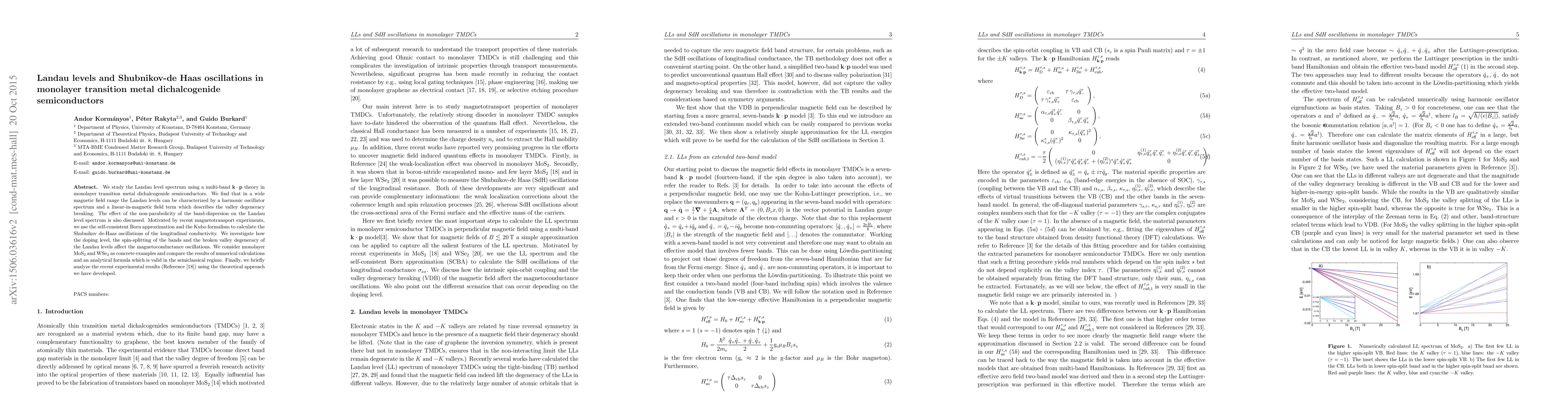 This research examines Landau levels and Shubnikov-de Haas oscillations in monolayer transition metal dichalcogenide semiconductors using multi-band $\mathbf{k}\cdot\mathbf{p}$ theory. It reveals a harmonic oscillator spectrum with a linear term for valley degeneracy breaking and discusses the impact of band-dispersion non-parabolicity, comparing results for MoS$_2$ and WSe$_2$ with recent experimental findings.