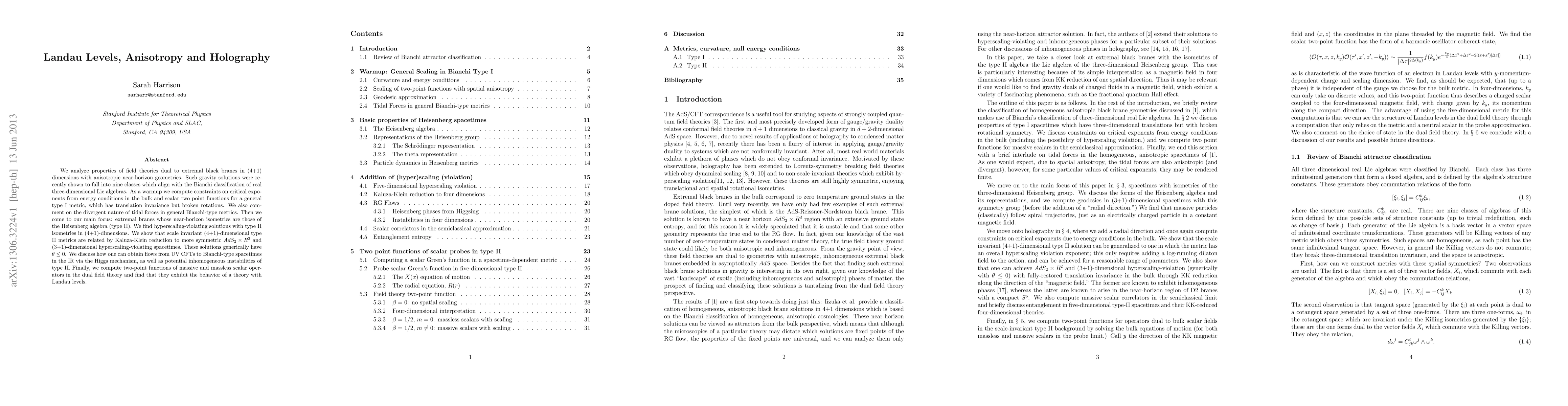 We analyze properties of field theories dual to extremal black branes in (4+1) dimensions with anisotropic near-horizon geometries. Such gravity solutions were recently shown to fall into nine classes which align with the Bianchi classification of real three-dimensional Lie algebras. As a warmup we compute constraints on critical exponents from energy conditions in the bulk and scalar two point functions for a general type I metric, which has translation invariance but broken rotations. We also comment on the divergent nature of tidal forces in general Bianchi-type metrics. Then we come to our main focus: extremal branes whose near-horizon isometries are those of the Heisenberg algebra (type II). We find hyperscaling-violating solutions with type II isometries in (4+1)-dimensions. We show that scale invariant (4+1)-dimensional type II metrics are related by Kaluza-Klein reduction to more symmetric $AdS_2\times R^2$ and (3+1)-dimensional hyperscaling-violating spacetimes. These solutions generically have $\theta \leq 0$. We discuss how one can obtain flows from UV CFTs to Bianchi-type spacetimes in the IR via the Higgs mechanism, as well as potential inhomogeneous instabilities of type II. Finally, we compute two-point functions of massive and massless scalar operators in the dual field theory and find that they exhibit the behavior of a theory with Landau levels.