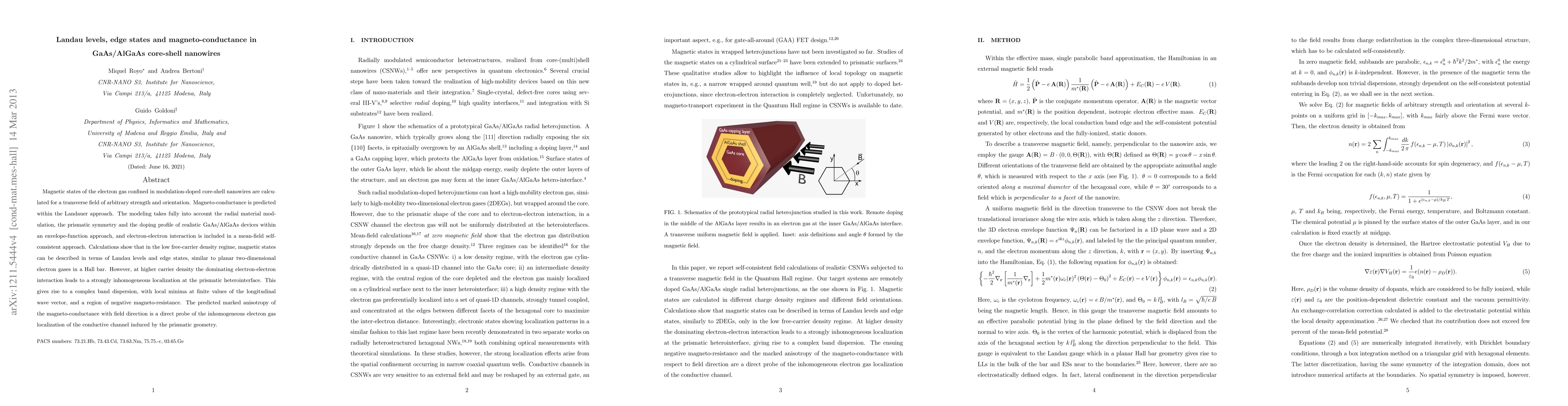 This paper investigates the magnetic states and magneto-conductance in GaAs/AlGaAs core-shell nanowires under transverse magnetic fields, revealing Landau levels and edge states at low carrier densities, while higher densities lead to electron-electron interaction-driven localization and complex band dispersion.
