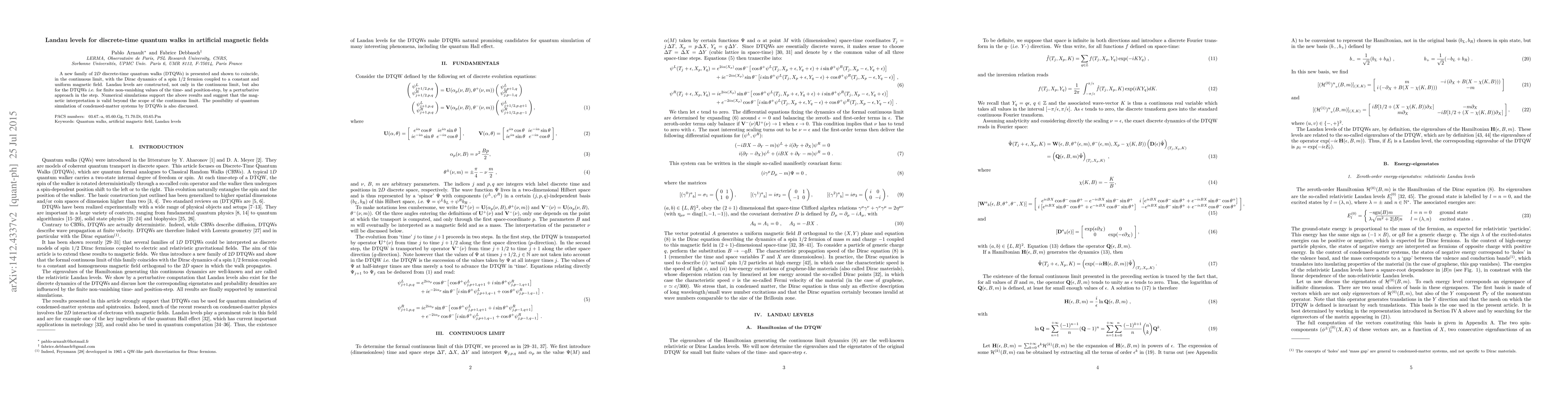 A new family of 2D discrete-time quantum walks (DTQWs) is presented and shown to coincide, in the continuous limit, with the Dirac dynamics of a spin 1/2 fermion coupled to a constant and uniform magnetic field. Landau levels are constructed, not only in the continuous limit, but also for the DTQWs i.e. for finite non-vanishing values of the time- and position-step, by a perturbative approach in the step. Numerical simulations support the above results and suggest that the magnetic interpretation is valid beyond the scope of the continuous limit. The possibility of quantum simulation of condensed-matter systems by DTQWs is also discussed.