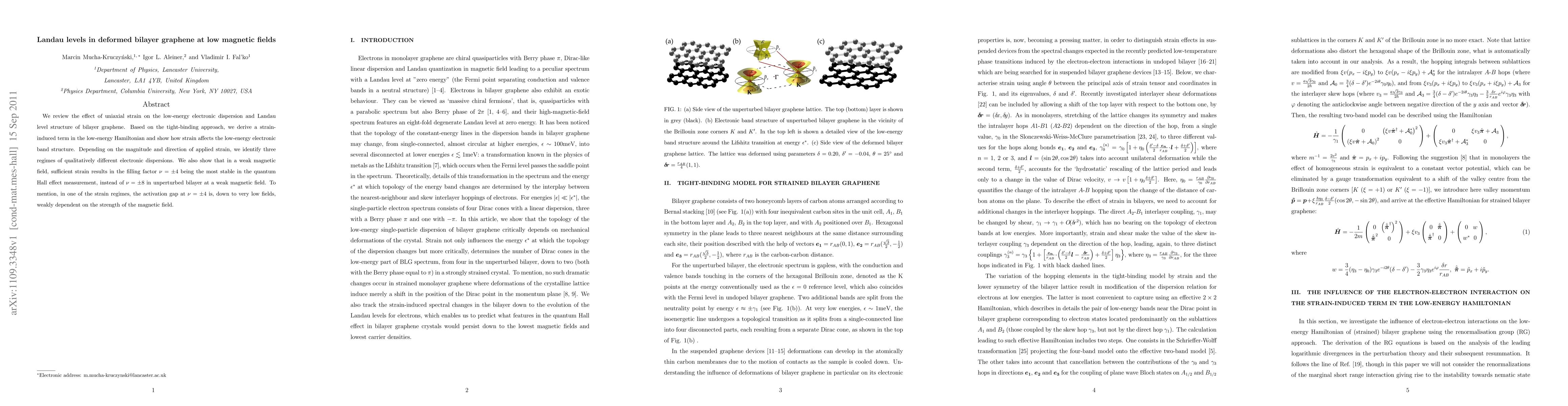 We review the effect of uniaxial strain on the low-energy electronic dispersion and Landau level structure of bilayer graphene. Based on the tight-binding approach, we derive a strain-induced term in the low-energy Hamiltonian and show how strain affects the low-energy electronic band structure. Depending on the magnitude and direction of applied strain, we identify three regimes of qualitatively different electronic dispersions. We also show that in a weak magnetic field, sufficient strain results in the filling factor ff=+-4 being the most stable in the quantum Hall effect measurement, instead of ff=+-8 in unperturbed bilayer at a weak magnetic field. To mention, in one of the strain regimes, the activation gap at ff=+-4 is, down to very low fields, weakly dependent on the strength of the magnetic field.