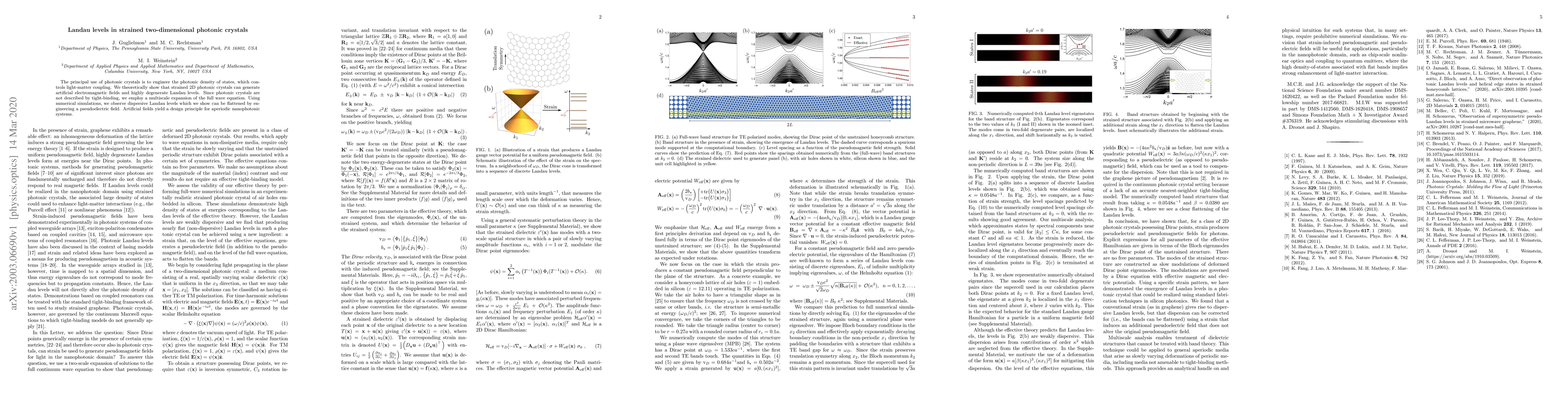 This research demonstrates that strained two-dimensional photonic crystals can create artificial electromagnetic fields and degenerate Landau levels, using a multiscale wave equation approach. Numerical simulations reveal dispersive Landau levels that can be flattened by engineering pseudoelectric fields, providing a new design principle for aperiodic nanophotonic systems.