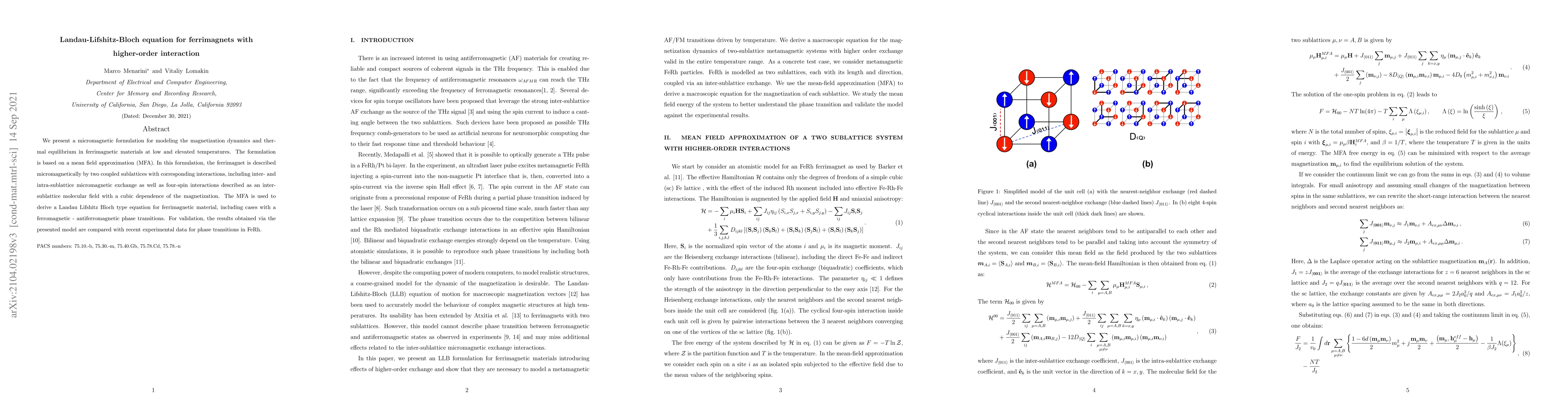We present a micromagnetic formulation for modeling the magnetization dynamics and thermal equilibrium in ferrimagnetic materials at low and elevated temperatures. The formulation is based on a mean field approximation (MFA). In this formulation, the ferrimagnet is described micromagnetically by two coupled sublattices with corresponding interactions, including inter- and intra-sublattice micromagnetic exchange as well as four-spin interactions described as an inter-sublattice molecular field with a cubic dependence of the magnetization. The MFA is used to derive a Landau Lifshitz Bloch type equation for ferrimagnetic material, including cases with a ferromagnetic - antiferromagnetic phase transitions. For validation, the results obtained via the presented model are compared with recent experimental data for phase transitions in FeRh.