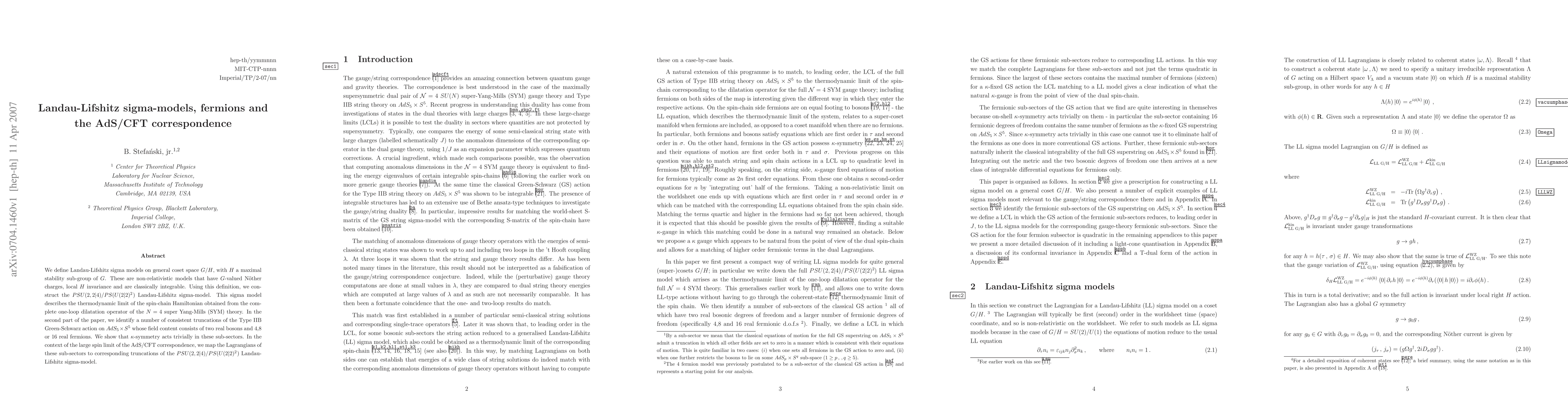 We define Landau-Lifshitz sigma models on general coset space $G/H$, with $H$ a maximal stability sub-group of $G$. These are non-relativistic models that have $G$-valued N\"other charges, local $H$ invariance and are classically integrable. Using this definition, we construct the $PSU(2,2|4)/PS(U(2|2)^2)$ Landau-Lifshitz sigma-model. This sigma model describes the thermodynamic limit of the spin-chain Hamiltonian obtained from the complete one-loop dilatation operator of the N=4 super Yang-Mills (SYM) theory. In the second part of the paper, we identify a number of consistent truncations of the Type IIB Green-Schwarz action on $AdS_5\times S^5$ whose field content consists of two real bosons and 4,8 or 16 real fermions. We show that $\kappa$-symmetry acts trivially in these sub-sectors. In the context of the large spin limit of the AdS/CFT correspondence, we map the Lagrangians of these sub-sectors to corresponding truncations of the $PSU(2,2|4)/PS(U(2|2)^2)$ Landau-Lifshitz sigma-model.