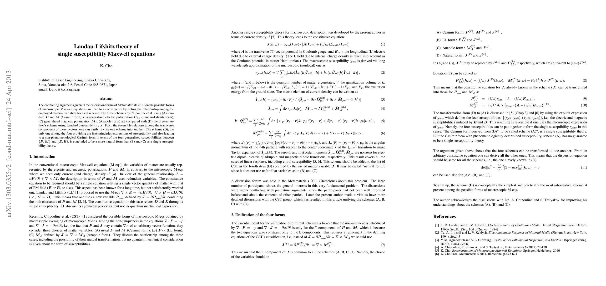 The conflicting arguments given in the discussion forum of Metamaterials 2011 on the possible forms of macroscopic Maxwell equations are lead to a convergence by noting the relationship among the employed material variables for each scheme. The three schemes by Chipouline et al. using (A) standard $\Vec{P}$ and $\Vec{M}$ (Casimir form), (B) generalized electric polarization $\Vec{P}_{LL}$ (Landau-Lifshitz form), (C) generalized magnetic polarization $\Vec{M}_{A}$ (Anapole form) are compared with (D) the present author's scheme using standard current density $\Vec{J}$. From the reversible relations among the transverse components of these vectors, one can easily rewrite one scheme into another. The scheme (D), the only one among the four providing the first-principles expressions of susceptibility and also leading to a non-phenomenological Casimir form in terms of the four generalized susceptibilities between $\{\Vec{P},\Vec{M}\}$ and $\{\Vec{E},\Vec{B}\}$, is concluded to be a more natural form than (B) and (C) as a single susceptibility theory.