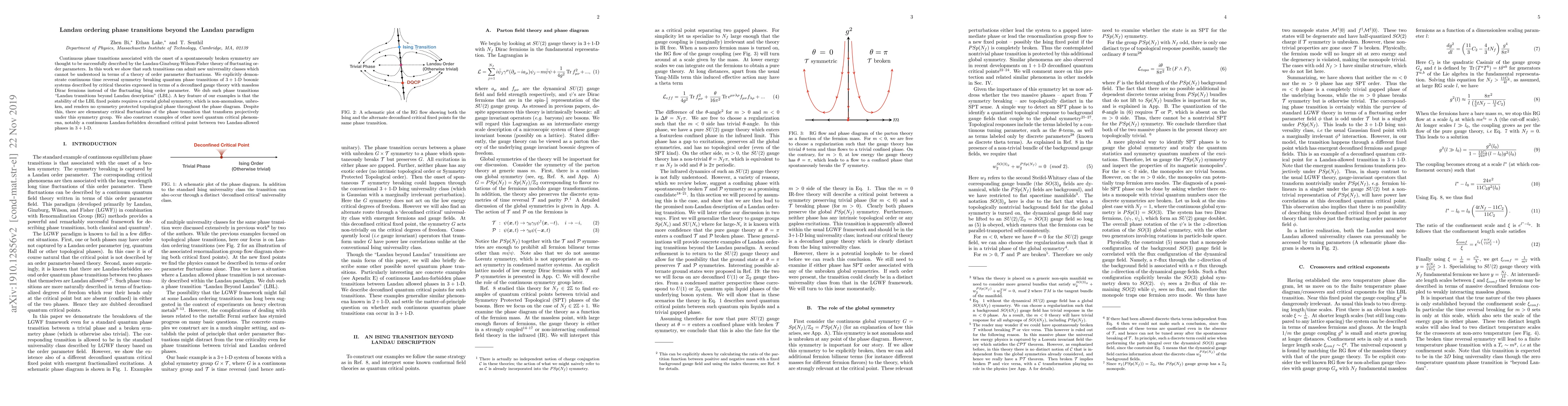 Continuous phase transitions associated with the onset of a spontaneously broken symmetry are thought to be successfully described by the Landau-Ginzburg-Wilson-Fisher theory of fluctuating order parameters. In this work we show that such transitions can admit new universality classes which cannot be understood in terms of a theory of order parameter fluctuations. We explicitly demonstrate continuous time reversal symmetry breaking quantum phase transitions of $3+1$-D bosonic systems described by critical theories expressed in terms of a deconfined gauge theory with massless Dirac fermions instead of the fluctuating Ising order parameter. We dub such phase transitions "Landau transitions beyond Landau description" (LBL). A key feature of our examples is that the stability of the LBL fixed points requires a crucial global symmetry, which is non-anomalous, unbroken, and renders no symmetry protected topological phase throughout the phase diagram. Despite this, there are elementary critical fluctuations of the phase transition that transform projectively under this symmetry group. We also construct examples of other novel quantum critical phenomena, notably a continuous Landau-forbidden deconfined critical point between two Landau-allowed phases in $3+1$-D.