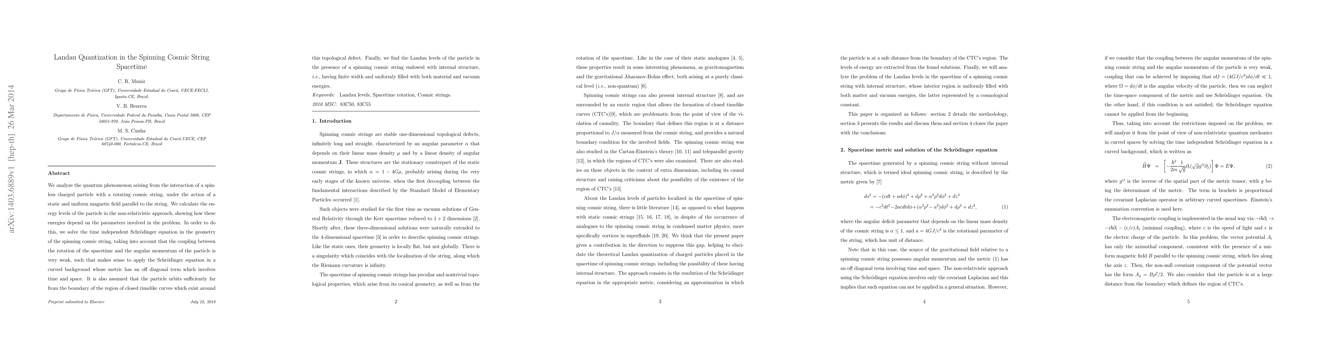 This paper investigates the quantum behavior of a spinless charged particle interacting with a spinning cosmic string under a magnetic field, calculating its energy levels in a non-relativistic framework. It finds the Landau quantization levels influenced by the cosmic string's rotation and internal structure.