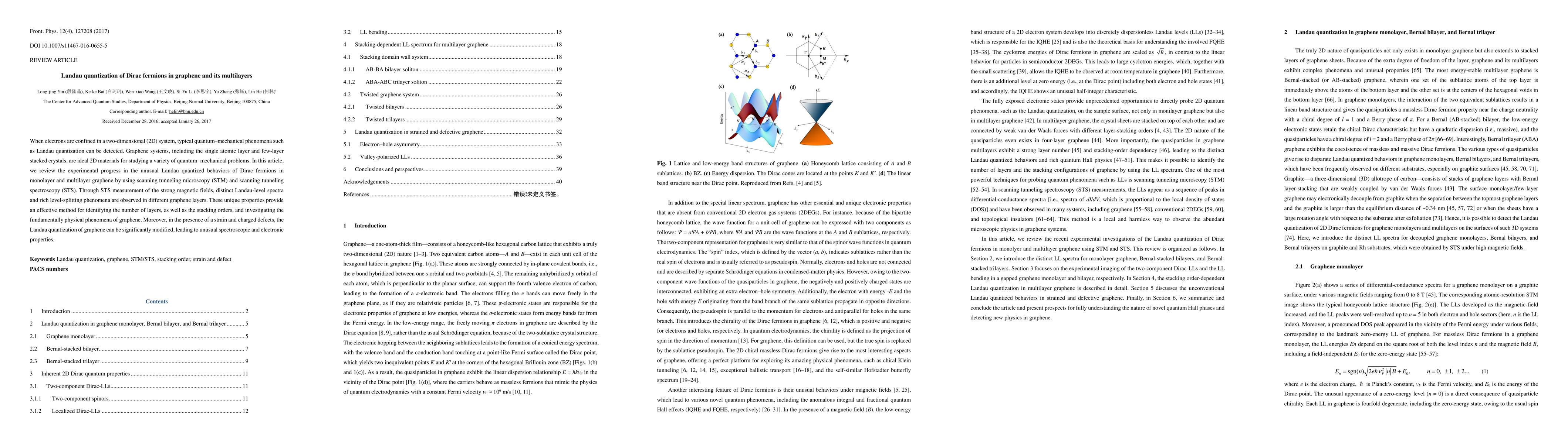 This paper reviews experimental findings on Landau quantization of Dirac fermions in graphene monolayers and multilayers using STM and STS. Observations include distinct Landau-level spectra and level splitting under strong magnetic fields, highlighting unique properties for identifying layer numbers and stacking orders, and noting modifications due to strain and defects.