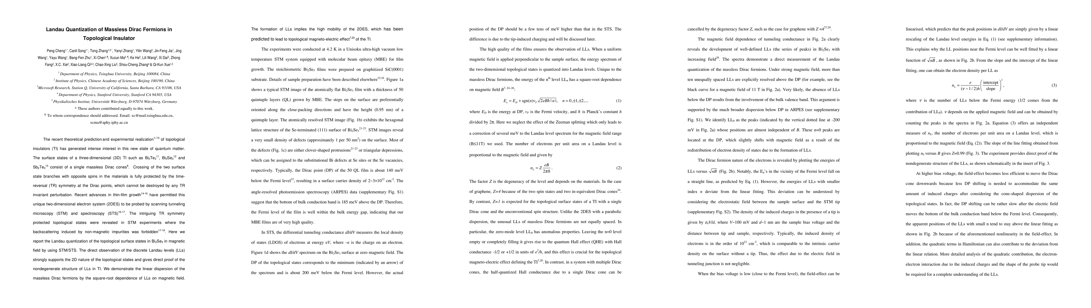 The recent theoretical prediction and experimental realization of topological insulators (TI) has generated intense interest in this new state of quantum matter. The surface states of a three-dimensional (3D) TI such as Bi_2Te_3, Bi_2Se_3 and Sb_2Te_3 consist of a single massless Dirac cones. Crossing of the two surface state branches with opposite spins in the materials is fully protected by the time reversal (TR) symmetry at the Dirac points, which cannot be destroyed by any TR invariant perturbation. Recent advances in thin-film growth have permitted this unique two-dimensional electron system (2DES) to be probed by scanning tunneling microscopy (STM) and spectroscopy (STS). The intriguing TR symmetry protected topological states were revealed in STM experiments where the backscattering induced by non-magnetic impurities was forbidden. Here we report the Landau quantization of the topological surface states in Bi_2Se_3 in magnetic field by using STM/STS. The direct observation of the discrete Landau levels (LLs) strongly supports the 2D nature of the topological states and gives direct proof of the nondegenerate structure of LLs in TI. We demonstrate the linear dispersion of the massless Dirac fermions by the square-root dependence of LLs on magnetic field. The formation of LLs implies the high mobility of the 2DES, which has been predicted to lead to topological magneto-electric effect of the TI.