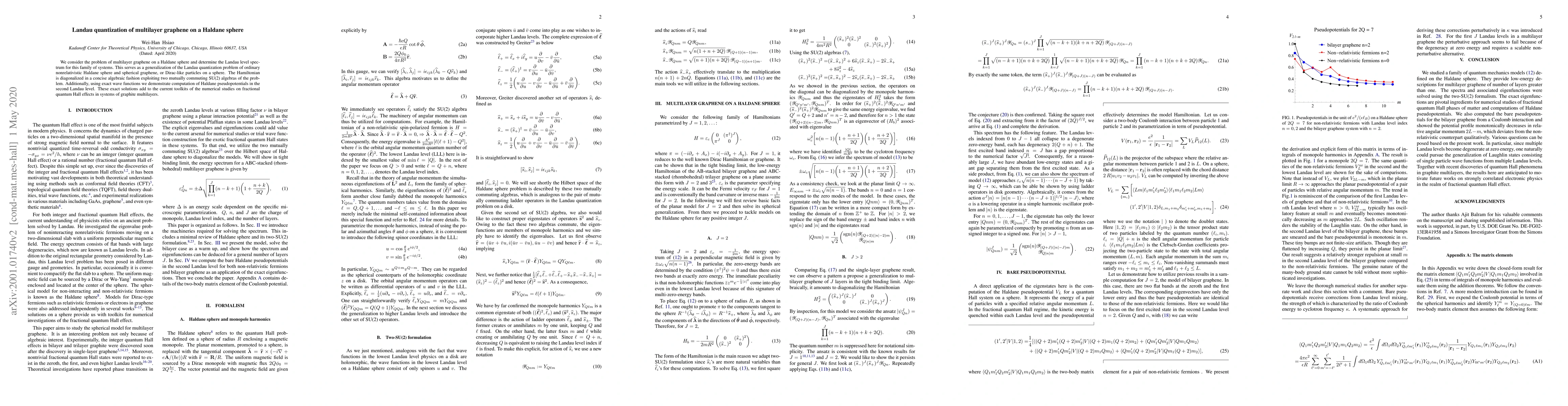 Summary: This paper investigates the Landau quantization in multilayer graphene on a Haldane sphere, deriving the Landau level spectrum through diagonalization of the Hamiltonian using two commuting SU(2) algebras. It also computes Haldane pseudopotentials in the second Landau level, providing exact solutions for fractional quantum Hall effect studies in graphite multilayers.