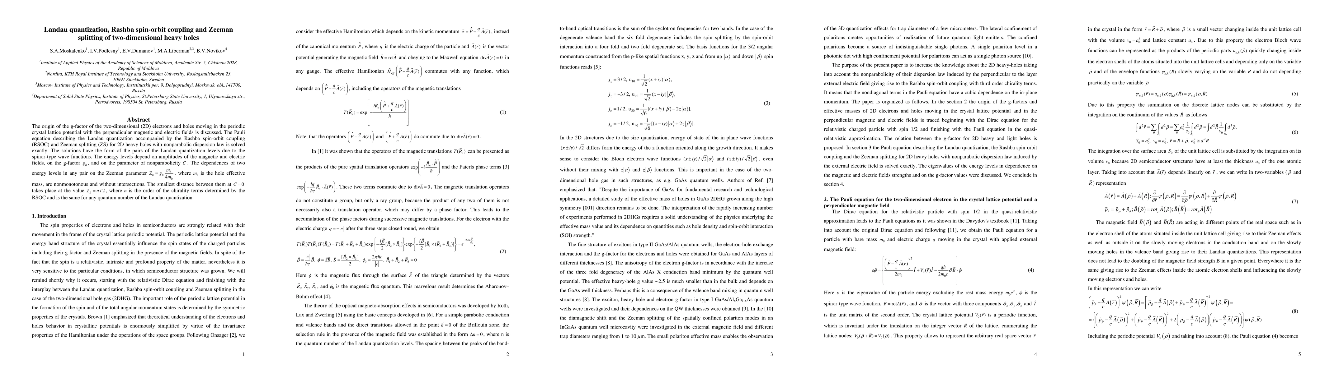 The origin of the g-factor of the two-dimensional (2D) electrons and holes moving in the periodic crystal lattice potential with the perpendicular magnetic and electric fields is discussed. The Pauli equation describing the Landau quantization accompanied by the Rashba spin-orbit coupling (RSOC) and Zeeman splitting (ZS) for 2D heavy holes with nonparabolic dispersion law is solved exactly. The solutions have the form of the pairs of the Landau quantization levels due to the spinor-type wave functions. The energy levels depend on amplitudes of the magnetic and electric fields, on the g-factor {g-h}, and on the parameter of nonparabolicity C. The dependences of two energy levels in any pair on the Zeeman parameter {Z_h}={g_h}{m_h}/4{m_0}, where {m_h} is the hole effective mass, are nonmonotonous and without intersections. The smallest distance between them at C=0 takes place at the value {Z_h}=n/2, where n is the order of the chirality terms determined by the RSOC and is the same for any quantum number of the Landau quantization.