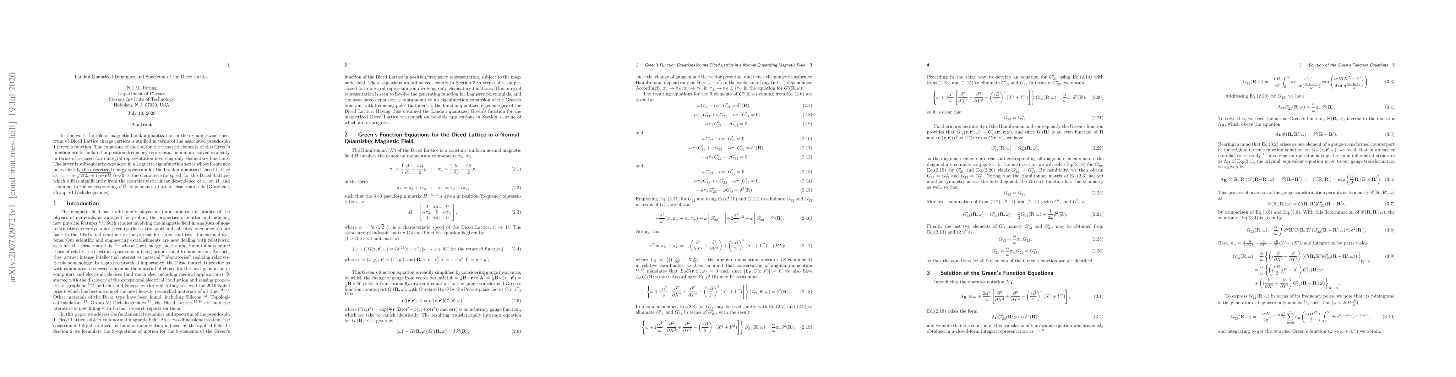 In this work the role of magnetic Landau quantization in the dynamics and spectrum of Diced Lattice charge carriers is studied in terms of the associated pseudospin 1 Green's function. The equations of motion for the 9 matrix elements of this Green's function are formulated in position/frequency representation and are solved explicitly in terms of a closed form integral representation involving only elementary functions. The latter is subsequently expanded in a Laguerre eigenfunction series whose frequency poles identify the discretized energy spectrum for the Landau-quantized Diced Lattice as $\epsilon_n = \pm\sqrt{2(2n+1)\alpha^2 eB}$ ($\alpha\sqrt{2}$ is the characteristic speed for the Diced Lattice) which differs significantly from the nonrelativistic linear dependence of $\epsilon_n$ on $B$, and is similar to the corresponding $\sqrt{B}-$dependence of other Dirac materials (Graphene, Group VI Dichalcogenides).
