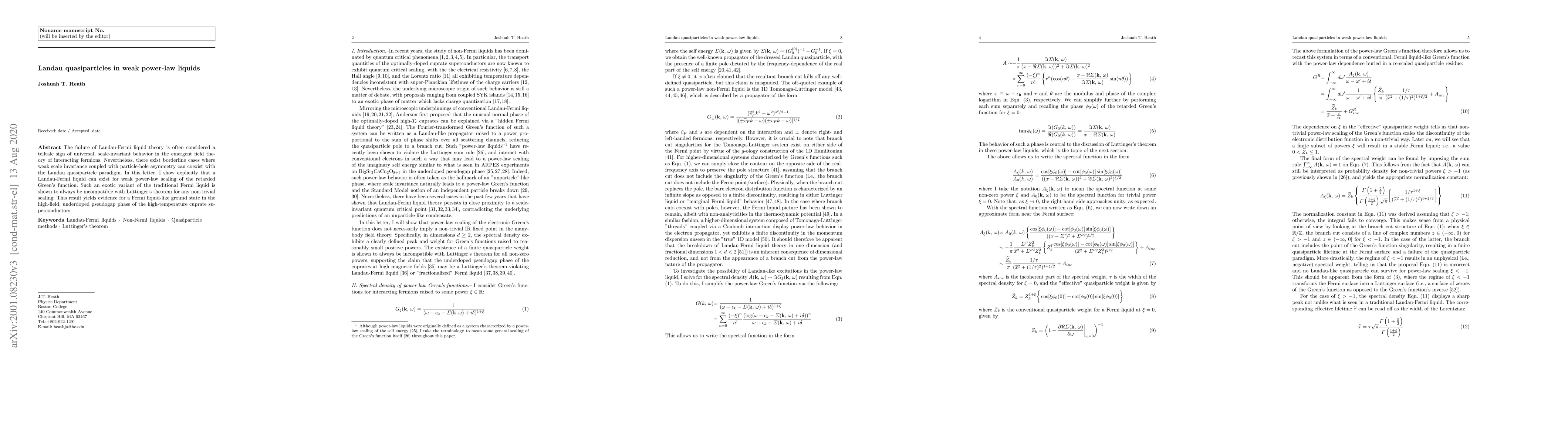 The failure of Landau-Fermi liquid theory is often considered a telltale sign of universal, scale-invariant behavior in the emergent field theory of interacting fermions. Nevertheless, there exist borderline cases where weak scale invariance coupled with particle-hole asymmetry can coexist with the Landau quasiparticle paradigm. In this letter, I show explicitly that a Landau-Fermi liquid can exist for weak power-law scaling of the retarded Green's function. Such an exotic variant of the traditional Fermi liquid, although exhibiting a finite quasiparticle weight and large quasiparticle lifetime, is shown to always be incompatible with Luttinger's theorem for any non-trivial scaling. This result yields evidence for a Fermi liquid-like ground state in the high-field, underdoped pseudogap phase of the high-temperature cuprate superconductors.