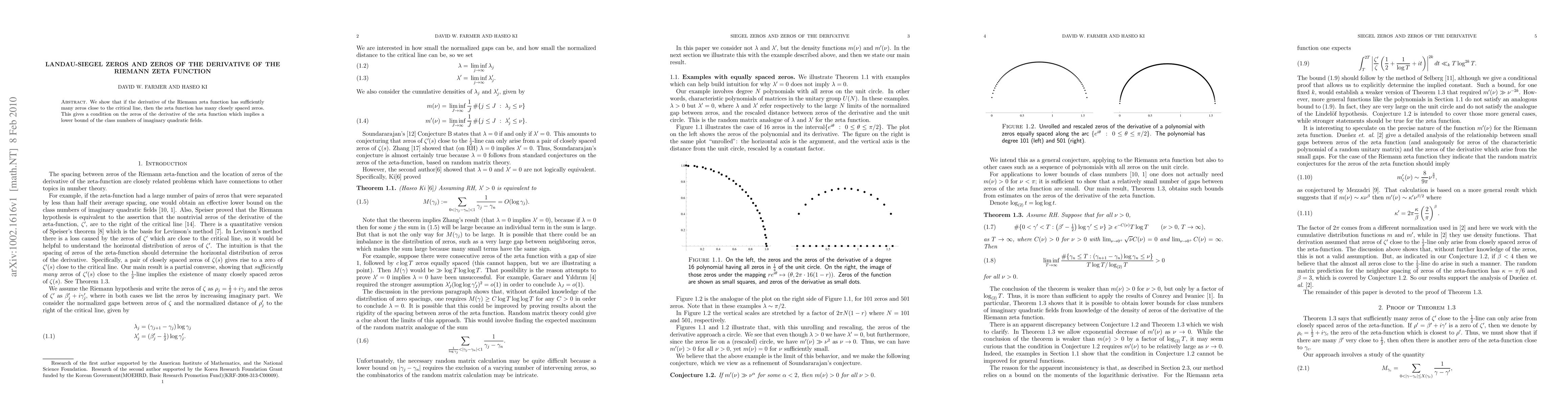 Summary: The paper establishes a connection between zeros of the derivative of the Riemann zeta function near the critical line and the presence of many closely spaced zeros of the zeta function itself, leading to a lower bound for the class numbers of imaginary quadratic fields.