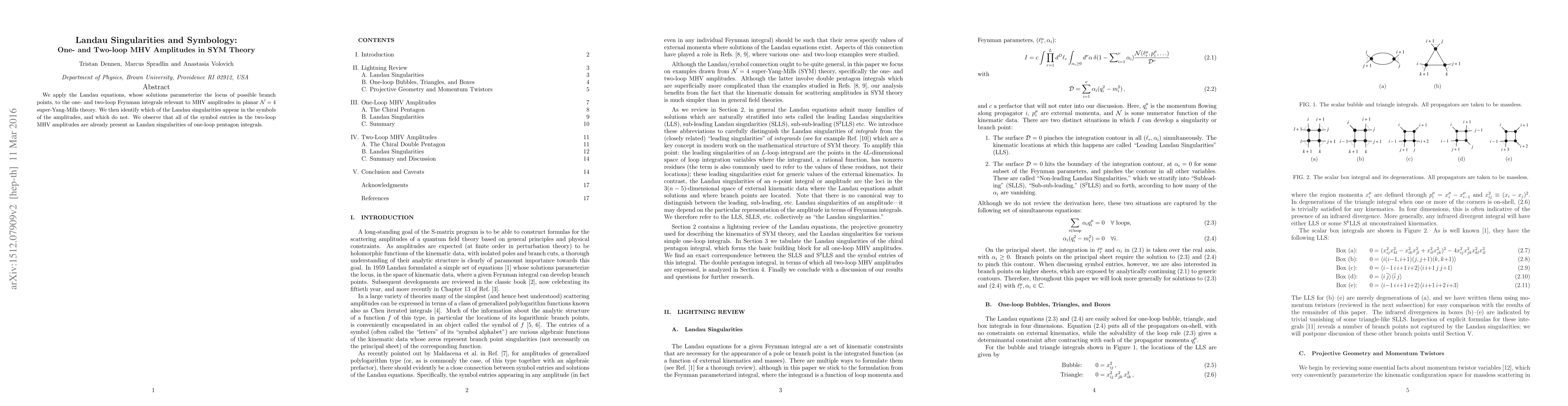 This paper investigates the Landau singularities in one- and two-loop Feynman integrals for MHV amplitudes in $\mathcal{N}=4$ super-Yang-Mills theory, finding that all two-loop MHV amplitude symbols are already present in the one-loop pentagon integrals. The study uses Landau equations to parameterize possible branch points.