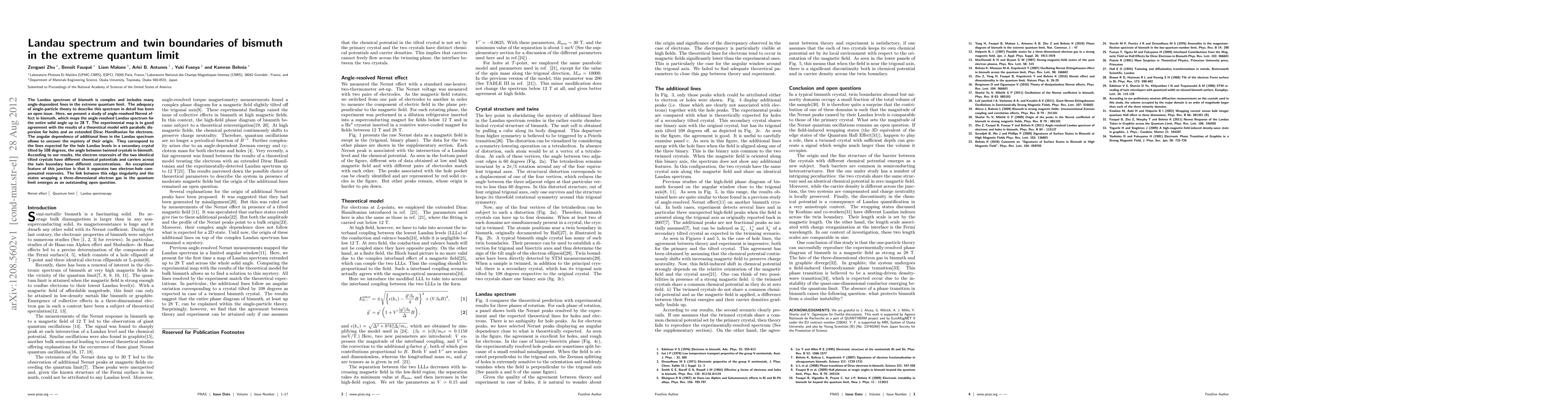 The Landau spectrum of bismuth is complex and includes many angle-dependent lines in the extreme quantum limit. The adequacy of single-particle theory to describe this spectrum in detail has been an open issue. Here, we present a study of angle-resolved Nernst effect in bismuth, which maps the angle-resolved Landau spectrum for the entire solid angle up to 28 T. The experimental map is in good agreement with the results of a theoretical model with parabolic dispersion for holes and an extended Dirac Hamiltonian for electrons. The angular dependence of additional lines in the Landau spectrum allows to uncover the mystery of their origin. They correspond to the lines expected for the hole Landau levels in a secondary crystal tilted by 108 degrees, the angle between twinned crystals in bismuth. According to our results, the electron reservoirs of the two identical tilted crystals have different chemical potentials and carriers across the twin boundary have different concentrations. An exceptional feature of this junction is that it separates two electron-hole compensated reservoirs. The link between this edge singularity and the states wrapping a three-dimensional electron gas in the quantum limit emerges as an outstanding open question.