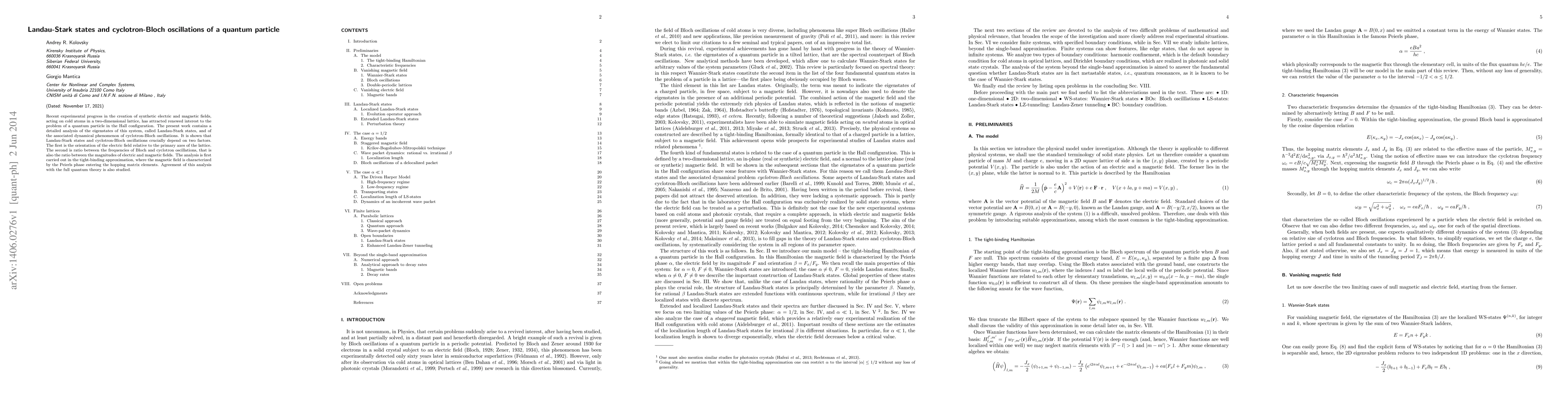This paper analyzes the eigenstates, known as Landau-Stark states, and the cyclotron-Bloch oscillations of a quantum particle in a Hall configuration under synthetic electric and magnetic fields. The study reveals that these phenomena depend significantly on the electric field's orientation and the ratio of electric to magnetic field strengths.