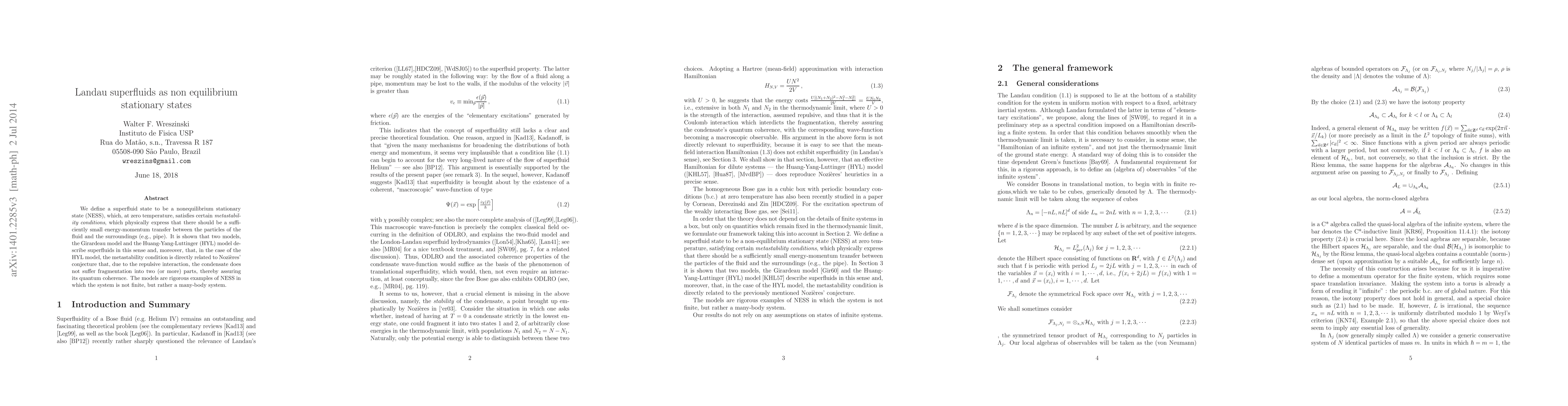 We define a superfluid state to be a nonequilibrium stationary state (NESS), which, at zero temperature, satisfies certain \emph{metastability conditions}, which physically express that there should be a sufficiently small energy-momentum transfer between the particles of the fluid and the surroundings (e.g., pipe). It is shown that two models, the Girardeau model and the Huang-Yang-Luttinger (HYL) model describe superfluids in this sense and, moreover, that, in the case of the HYL model, the metastability condition is directly related to Nozi\`{e}res' conjecture that, due to the repulsive interaction, the condensate does not suffer fragmentation into two (or more) parts, thereby assuring its quantum coherence. The models are rigorous examples of NESS in which the system is not finite, but rather a many-body system. \end{abstract}