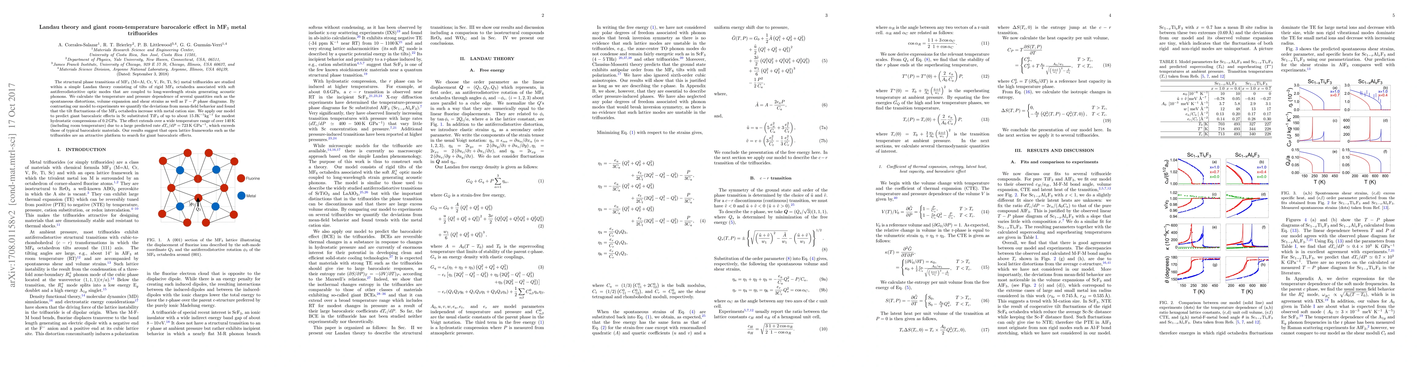 The structural phase transitions of MF$_3$ (M=Al, Cr, V, Fe, Ti, Sc) metal trifluorides are studied within a simple Landau theory consisting of tilts of rigid MF$_6$ octahedra associated with soft antiferrodistoritive optic modes that are coupled to long-wavelength strain generating acoustic phonons. We calculate the temperature and pressure dependence of several quantities such as the spontaneous distortions, volume expansion and shear strains as well as $T-P$ phase diagrams. By contrasting our model to experiments we quantify the deviations from mean-field behavior and found that the tilt fluctuations of the MF$_6$ octahedra increase with metal cation size. We apply our model to predict giant barocaloric effects in Sc substituted TiF$_3$ of up to about $15\,$JK$^{-1}$kg$^{-1}$ for modest hydrostatic compressions of $0.2\,$GPa. The effect extends over a wide temperature range of over $140\,$K (including room temperature) due to a large predicted rate $dT_c/dP = 723\,$K GPa$^{-1}$, which exceeds those of typical barocaloric materials. Our results suggest that open lattice frameworks such as the trifluorides are an attractive platform to search for giant barocaloric effects.