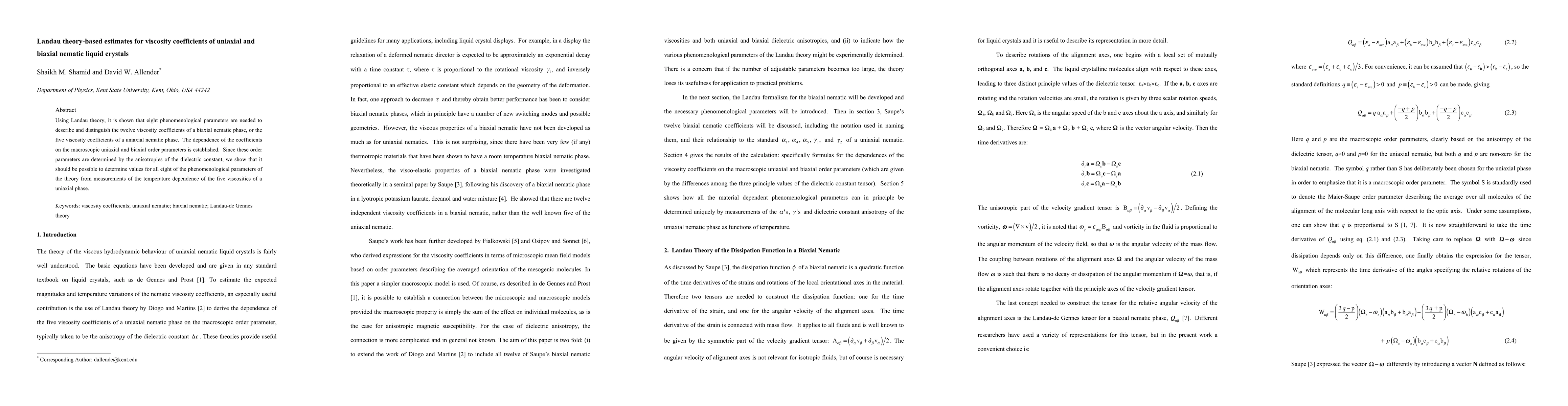 This paper utilizes Landau theory to determine the eight phenomenological parameters required to describe the viscosity coefficients in uniaxial and biaxial nematic liquid crystals. It establishes the relationship between these coefficients and macroscopic order parameters, which are influenced by the dielectric constant anisotropies, allowing for the determination of these parameters through temperature-dependent viscosity measurements.