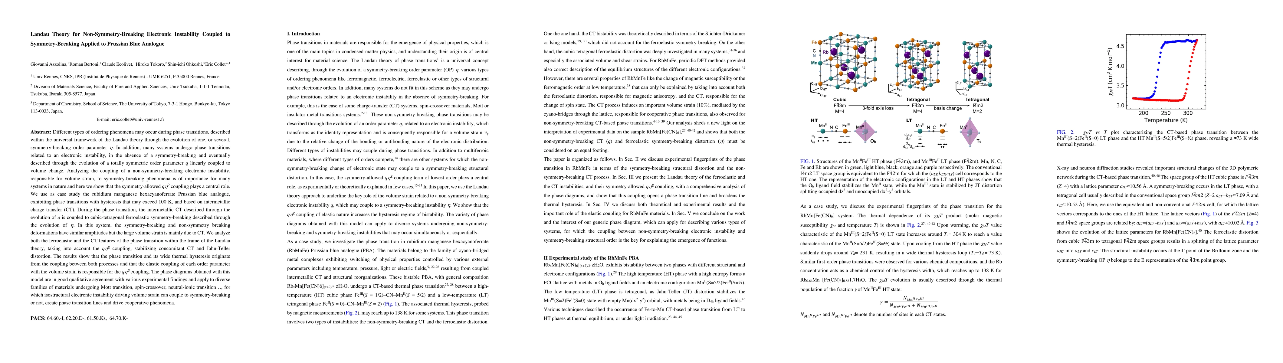 Different types of ordering phenomena may occur during phase transitions, described within the universal framework of the Landau theory through the evolution of one, or several, symmetry-breaking order parameter h. In addition, many systems undergo phase transitions related to an electronic instability, in the absence of a symmetry-breaking and eventually described through the evolution of a totally symmetric order parameter q linearly coupled to volume change. Analyzing the coupling of a non-symmetry-breaking electronic instability, responsible for volume strain, to symmetry-breaking phenomena is of importance for many systems in nature and here we show that the symmetry-allowed qh2 coupling plays a central role. We use as case study the rubidium manganese hexacyanoferrate Prussian blue analogue, exhibiting phase transitions with hysteresis that may exceed 100 K, and based on intermetallic charge transfer (CT). During the phase transition, the intermetallic CT described through the evolution of q is coupled to cubic-tetragonal ferroelastic symmetry-breaking described through the evolution of h. In this system, the symmetry-breaking and non-symmetry breaking deformations have similar amplitudes but the large volume strain is mainly due to CT. We analyze both the ferroelastic and the CT features of the phase transition within the frame of the Landau theory, taking into account the qh2 coupling, stabilizing concomitant CT and Jahn-Teller distortion. The phase diagrams obtained with this model are in good qualitative agreement with various experimental findings and apply to diverse families of materials undergoing Mott transition, spin-crossover, neutral-ionic transition, for which isostructural electronic instability driving volume strain can couple to symmetry-breaking or not, create phase transition lines and drive cooperative phenomena.