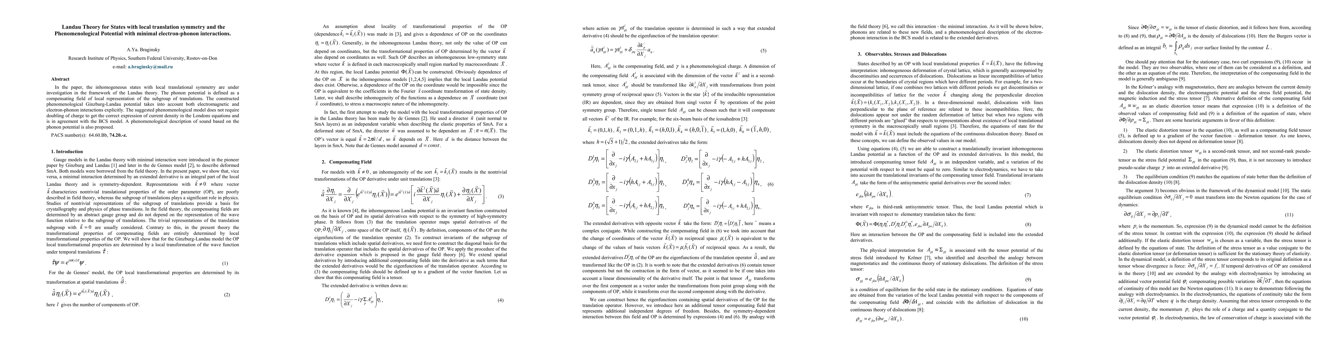 In the paper, the inhomogeneous states with local translational symmetry are under investigation in the framework of the Landau theory. The phonon potential is defined as a compensating field of local representation of the subgroup of translations. The constructed phenomenological Ginzburg-Landau potential takes into account both electromagnetic and electron-phonon interactions explicitly. The suggested phenomenological model does not require doubling of charge to get the correct expression of current density in the Londons equations and is in agreement with the BCS model. A phenomenological description of sound based on the phonon potential is also proposed.