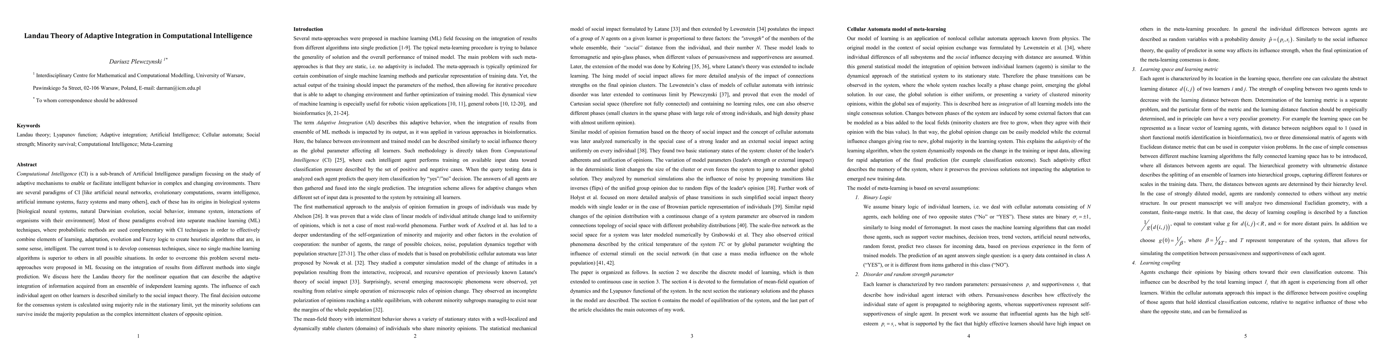 Computational Intelligence (CI) is a sub-branch of Artificial Intelligence paradigm focusing on the study of adaptive mechanisms to enable or facilitate intelligent behavior in complex and changing environments. There are several paradigms of CI [like artificial neural networks, evolutionary computations, swarm intelligence, artificial immune systems, fuzzy systems and many others], each of these has its origins in biological systems [biological neural systems, natural Darwinian evolution, social behavior, immune system, interactions of organisms with their environment]. Most of those paradigms evolved into separate machine learning (ML) techniques, where probabilistic methods are used complementary with CI techniques in order to effectively combine elements of learning, adaptation, evolution and Fuzzy logic to create heuristic algorithms that are, in some sense, intelligent. The current trend is to develop consensus techniques, since no single machine learning algorithms is superior to others in all possible situations. In order to overcome this problem several meta-approaches were proposed in ML focusing on the integration of results from different methods into single prediction. We discuss here the Landau theory for the nonlinear equation that can describe the adaptive integration of information acquired from an ensemble of independent learning agents. The influence of each individual agent on other learners is described similarly to the social impact theory. The final decision outcome for the consensus system is calculated using majority rule in the stationary limit, yet the minority solutions can survive inside the majority population as the complex intermittent clusters of opposite opinion.