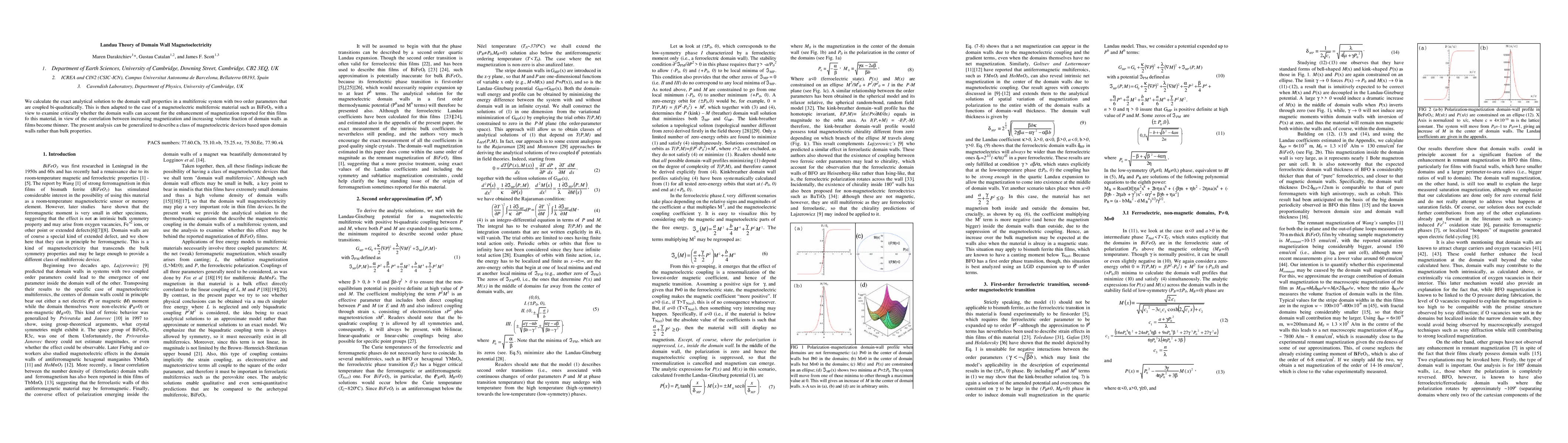 We calculate the exact analytical solution to the domain wall properties in a multiferroic system with two order parameters that are coupled bi-quadratically. This is then adapted to the case of a magnetoelectric multiferroic material such as BiFeO3, with a view to examine critically whether the domain walls can account for the enhancement of magnetization reported for thin films fo this material, in view of the correlation between increasing magnetization and increasing volume fraction of domain walls as films become thinner. The present analysis can be generalized to describe a class of magnetoelectric devices based upon domain walls rather than bulk properties.