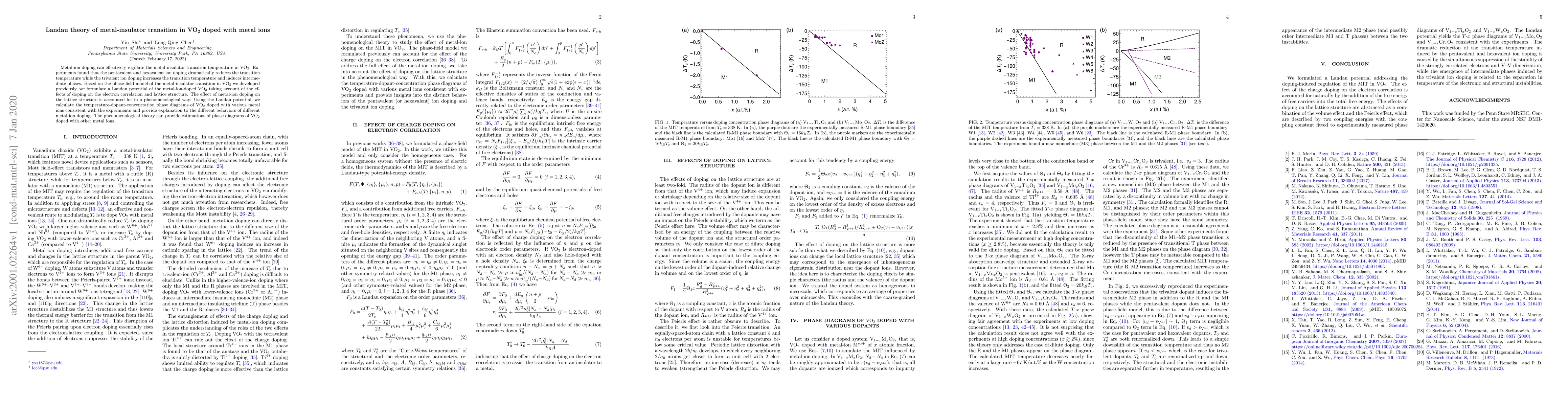 Metal-ion doping can effectively regulate the metal-insulator transition temperature in $\mathrm{VO}_2$. Experiments found that the pentavalent and hexavalent ion doping dramatically reduces the transition temperature while the trivalent ion doping increases the transition temperature and induces intermediate phases. Based on the phase-field model of the metal-insulator transition in $\mathrm{VO}_2$ we developed previously, we formulate a Landau potential of the metal-ion-doped $\mathrm{VO}_2$ taking account of the effects of doping on the electron correlation and lattice structure. The effect of metal-ion doping on the lattice structure is accounted for in a phenomenological way. Using the Landau potential, we calculate the temperature-dopant-concentration phase diagrams of $\mathrm{VO}_2$ doped with various metal ions consistent with the experiments and provide explanation to the different behaviors of different metal-ion doping. The phenomenological theory can provide estimations of phase diagrams of $\mathrm{VO}_2$ doped with other metal ions.
