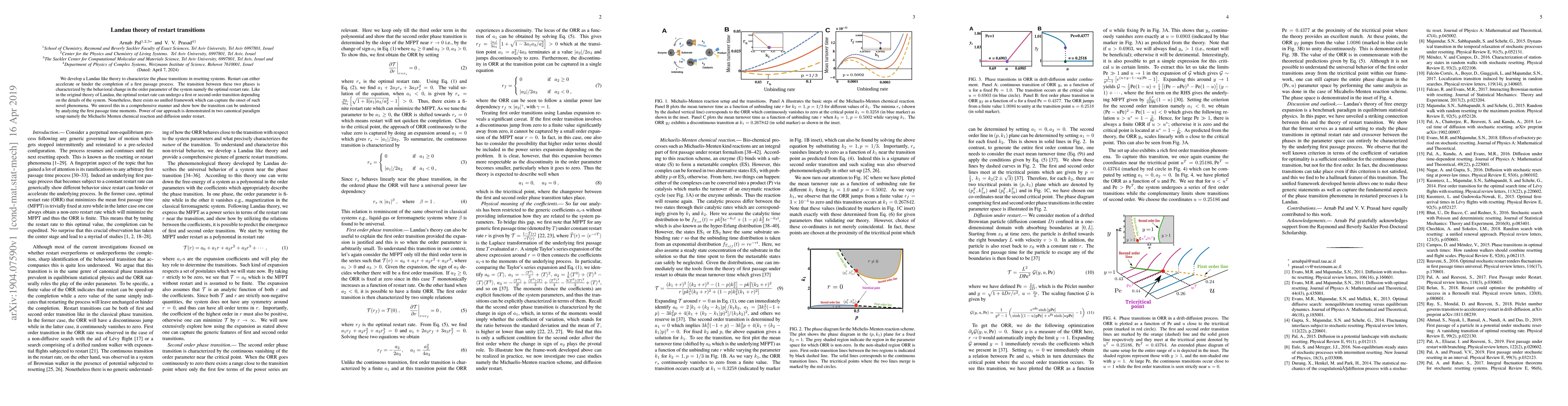 This paper develops a Landau theory to describe phase transitions in resetting systems, where restarts can either speed up or delay a first passage process. It introduces a unified framework to characterize the transition in the optimal restart rate, demonstrating its application through the Michaelis Menten reaction and diffusion under restart scenarios.