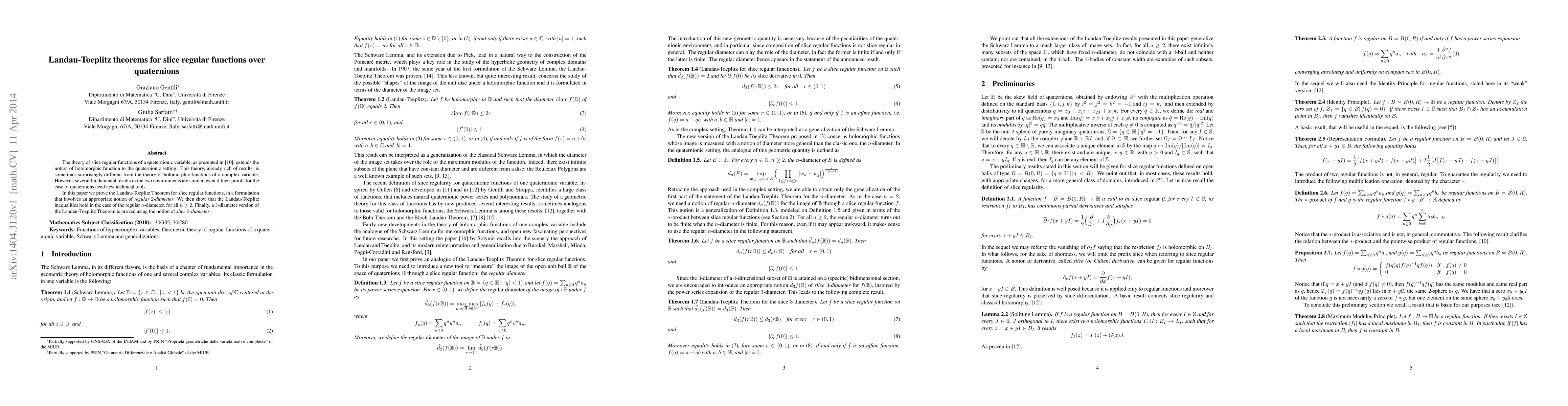 The paper proves Landau-Toeplitz theorems for slice regular functions over quaternions, extending fundamental results from complex variable theory with new technical tools.