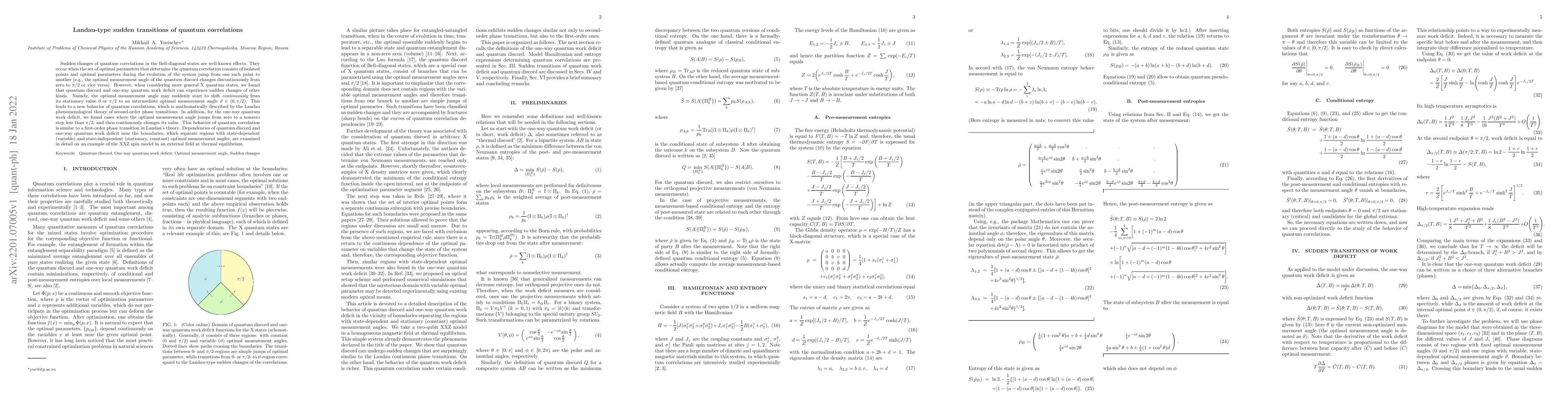 Sudden changes of quantum correlations in the Bell-diagonal states are well-known effects. They occur when the set of optimal parameters that determine the quantum correlation consists of isolated points and optimal parameters during the evolution of the system jump from one such point to another (e.g., the optimal measurement angle of the quantum discord changes discontinuously from zero to $\pi/2$ or vice versa). However, when considering more general X quantum states, we found that quantum discord and one-way quantum work deficit can experience sudden changes of other kinds. Namely, the optimal measurement angle may suddenly start to shift {\em continuously} from its stationary value 0 or $\pi/2$ to an intermediate optimal measurement angle $\vartheta\in(0,\pi/2)$. This leads to a new behavior of quantum correlations, which is mathematically described by the Landau phenomenological theory of second-order phase transitions. In addition, for the one-way quantum work deficit, we found cases where the optimal measurement angle jumps from zero to a nonzero step less than $\pi/2$, and then continuously changes its value. This behavior of quantum correlation is similar to a first-order phase transition in Landau's theory. Dependencies of quantum discord and one-way quantum work deficit near the boundaries, which separate regions with state-dependent (variable) and state-independent (stationary, constant) optimal measurement angles, are examined in detail on an example of the XXZ spin model in an external field at thermal equilibrium.