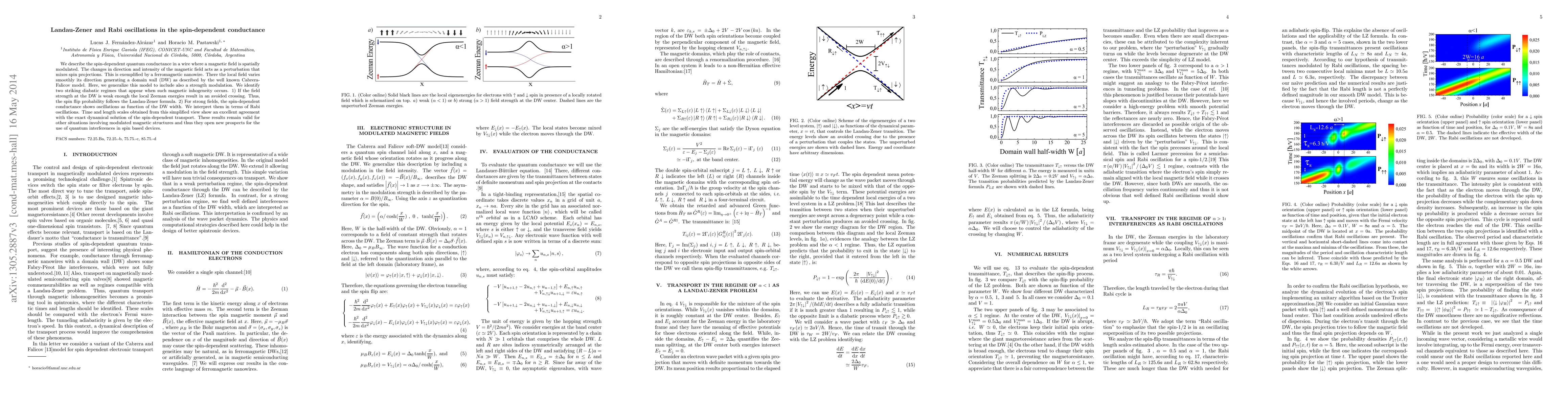 We describe the spin-dependent quantum conductance in a wire where a magnetic field is spatially modulated. The change in direction and intensity of the magnetic field acts as a perturbation that mixes spin projections. This is exemplified by a ferromagnetic nanowire. There the local field varies smoothly its direction generating a domain wall (DW) as described by the well-known Cabrera-Falicov model. Here, we generalize this model to include also a strength modulation. We identify two striking diabatic regimes that appear when such magnetic inhogeneity occurs. 1) If the field strength at the DW is weak enough, the local Zeeman energies result in an avoided crossing. Thus, the spin-flip probability follows the Landau-Zener formula. 2) For strong fields, the spin-dependent conductance shows oscillations as a function of the DW width. We interpret them in terms of Rabi oscillations. Time and length scales obtained from this simplified view show an excellent agreement with the exact dynamical solution of the spin-dependent transport. These results remain valid for other situations involving modulated magnetic structures and thus they open new prospects for the use of quantum interferences in spin-based devices. This paper is dedicated to the memory of the lifelong collaborator Patricia Rebeca Levstein.