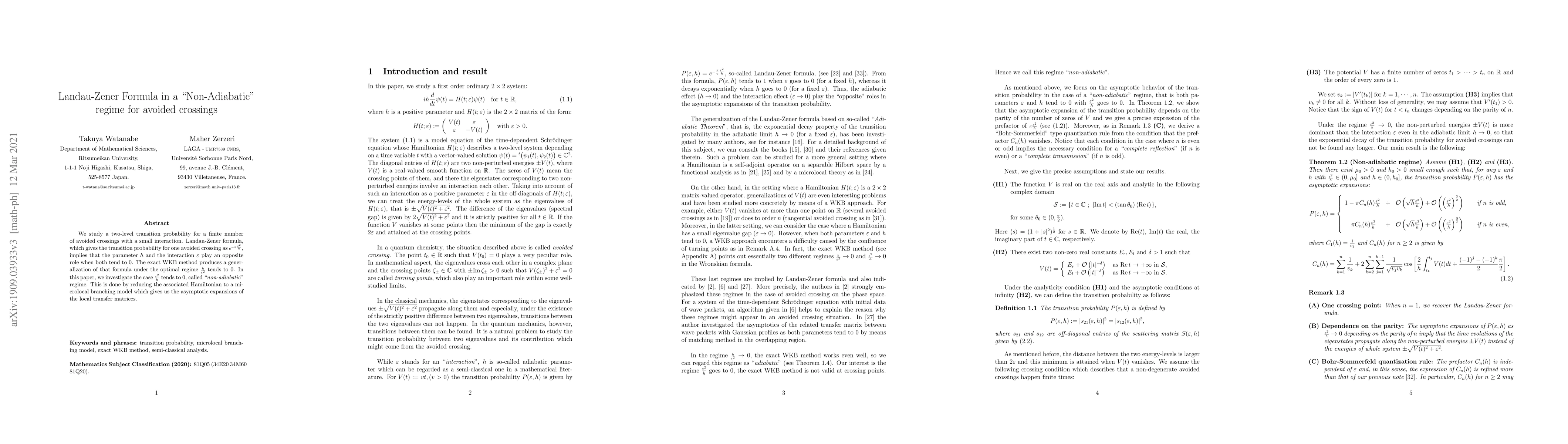 We study a two-level transition probability for a finite number of avoided crossings with a small interaction. Landau-Zener formula, which gives the transition probability for one avoided crossing as $e^{-\pi\frac{\varepsilon^{2}}{h}}$, implies that the parameter $h$ and the interaction $\varepsilon$ play an opposite role when both tend to $0$. The exact WKB method produces a generalization of that formula under the optimal regime $\frac{h}{\varepsilon^2}$ tends to~0. In this paper, we investigate the case $\frac{\varepsilon^2}{h}$ tends to 0, called "non-adiabatic" regime. This is done by reducing the associated Hamiltonian to a microlocal branching model which gives us the asymptotic expansions of the local transfer matrices.