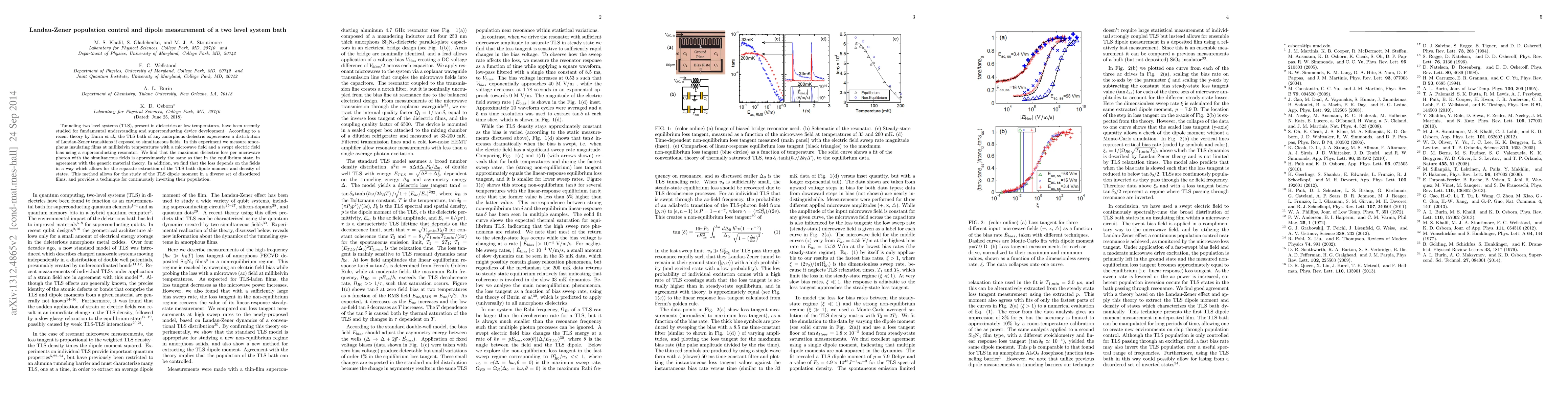This research investigates tunneling two level systems (TLS) in dielectrics using Landau-Zener transitions under simultaneous fields. The study reveals that the dielectric loss per microwave photon remains consistent with theoretical predictions, and it enables the extraction of the TLS bath dipole moment and density of states.